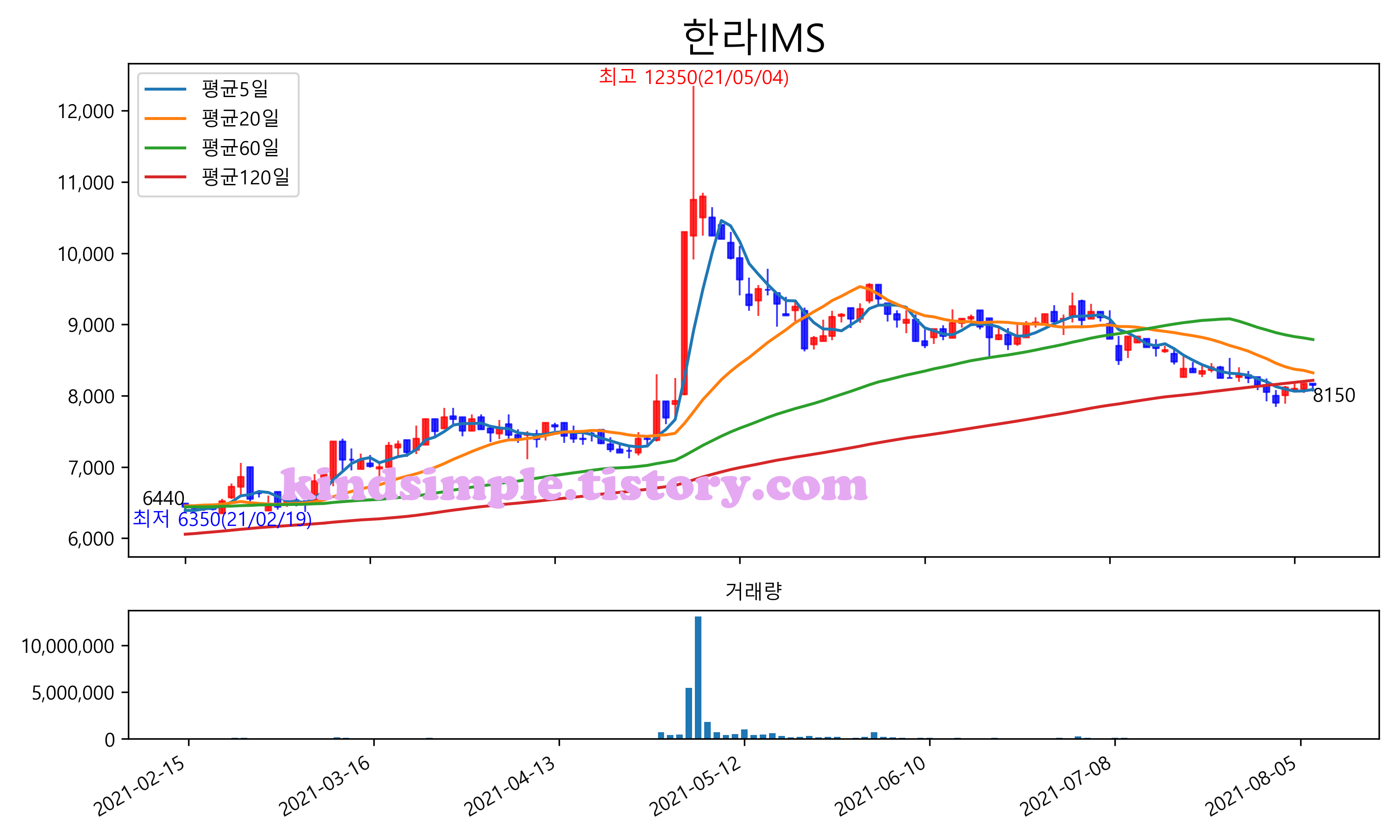 최근 6개월간 캔들차트 및 이동평균선입니다.