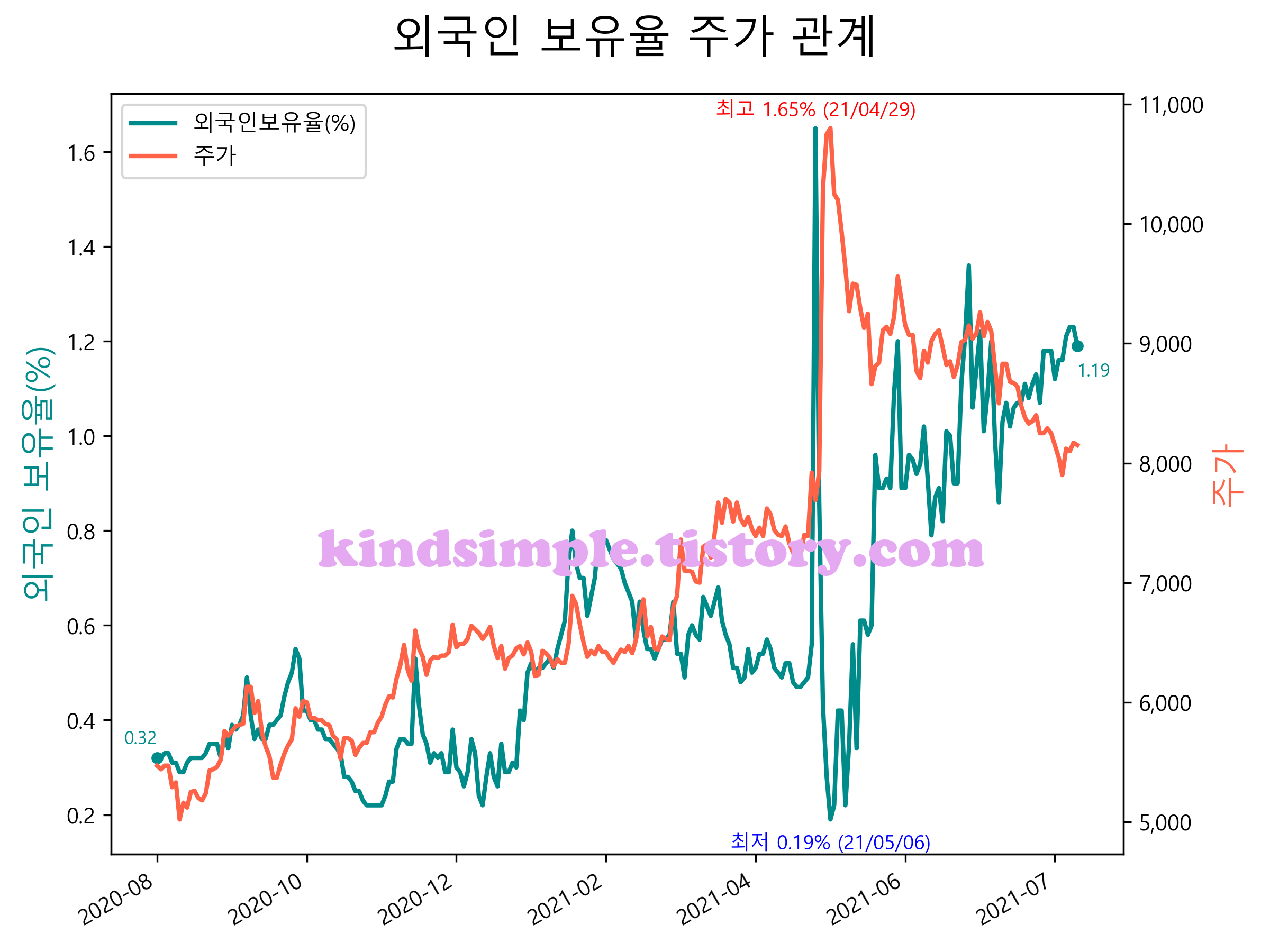 최근 1년간 외국인 보유율 및 주가와의 관계입니다.