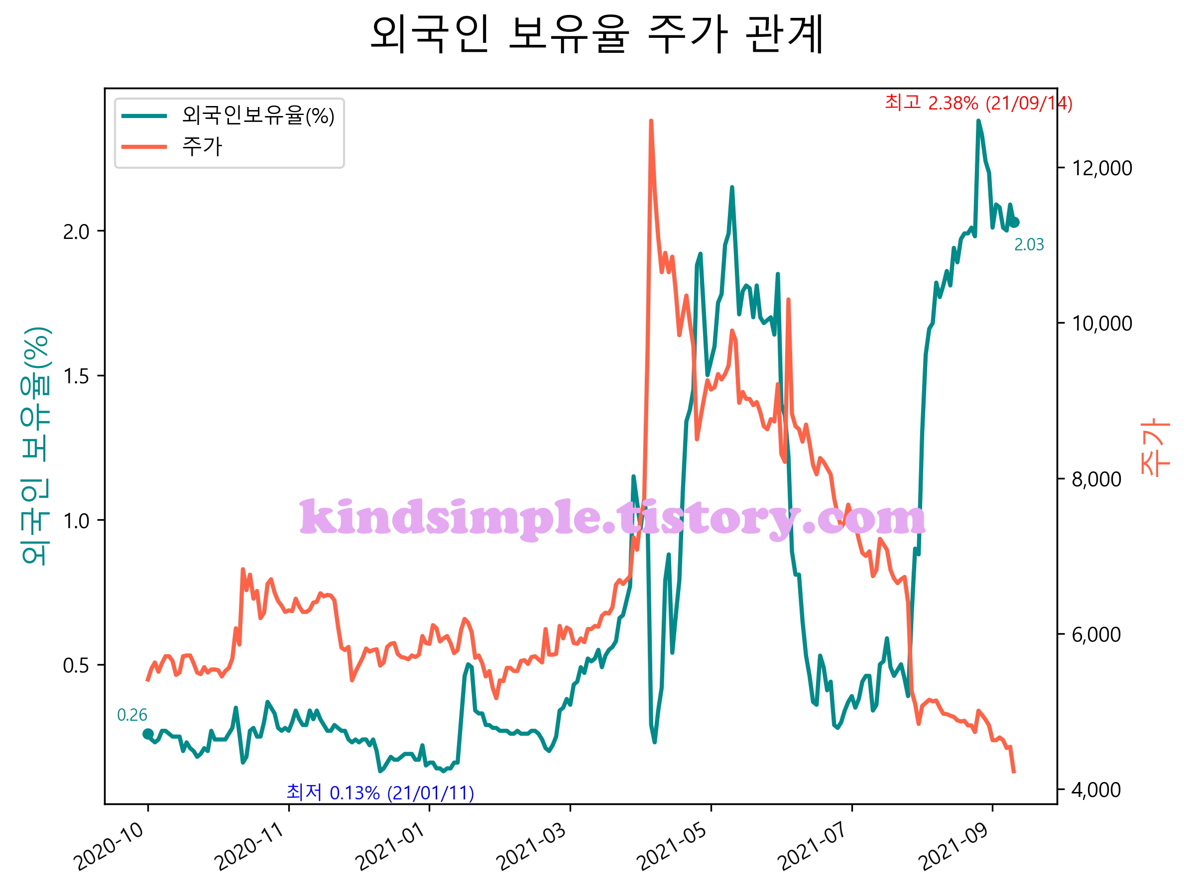 최근 1년간 외국인 보유율 및 주가와의 관계입니다.
