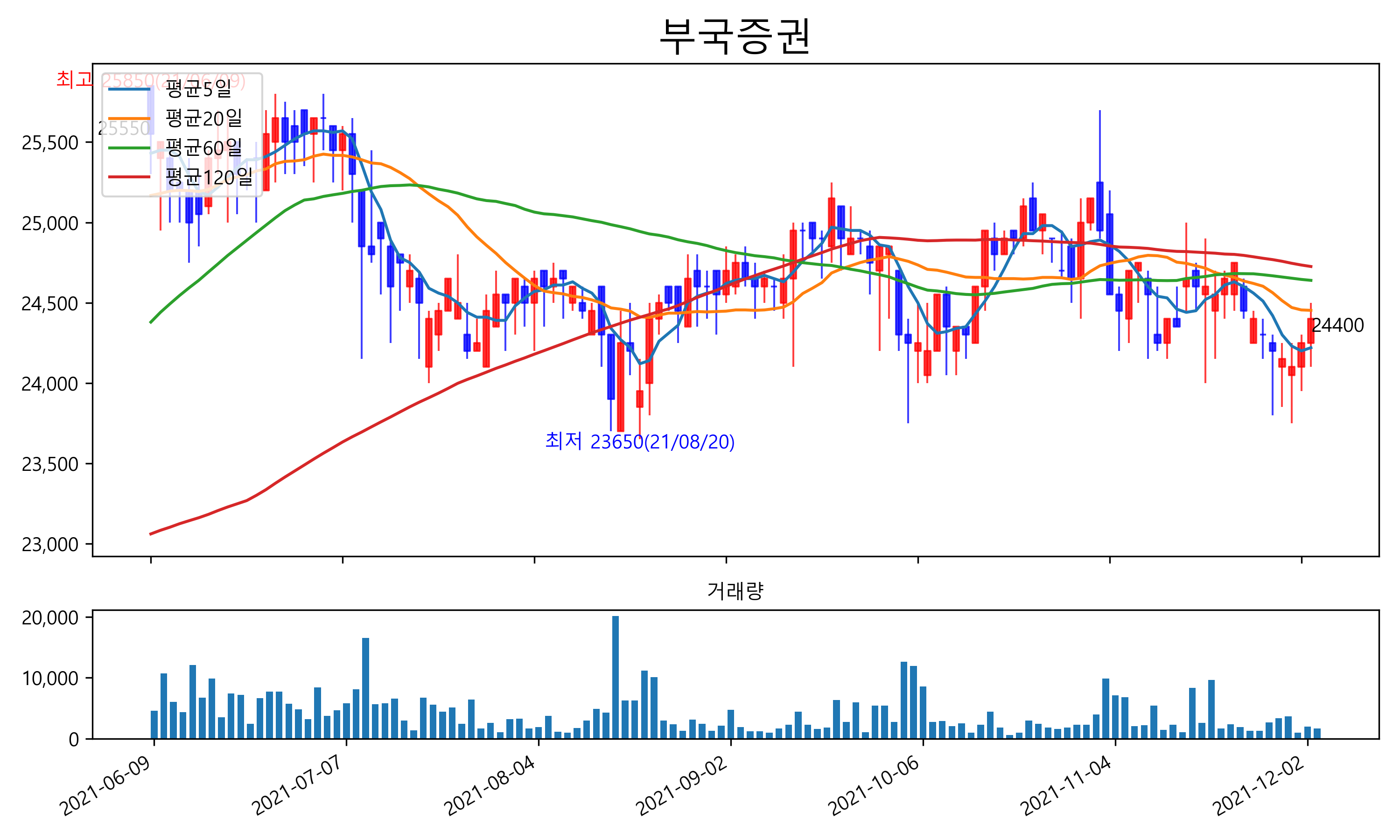 최근 6개월간 캔들차트 및 이동평균선입니다.