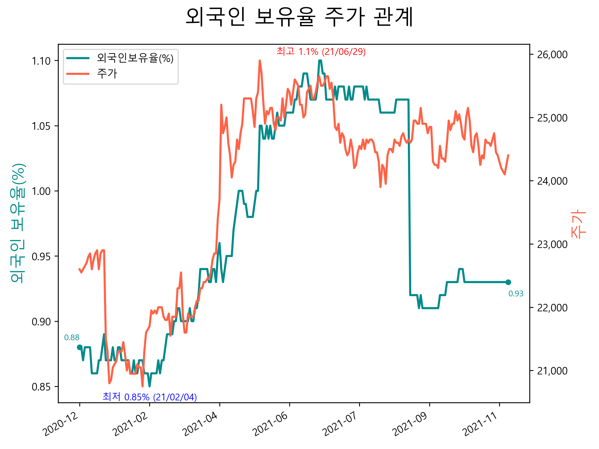 최근 1년간 외국인 보유율 및 주가와의 관계입니다.