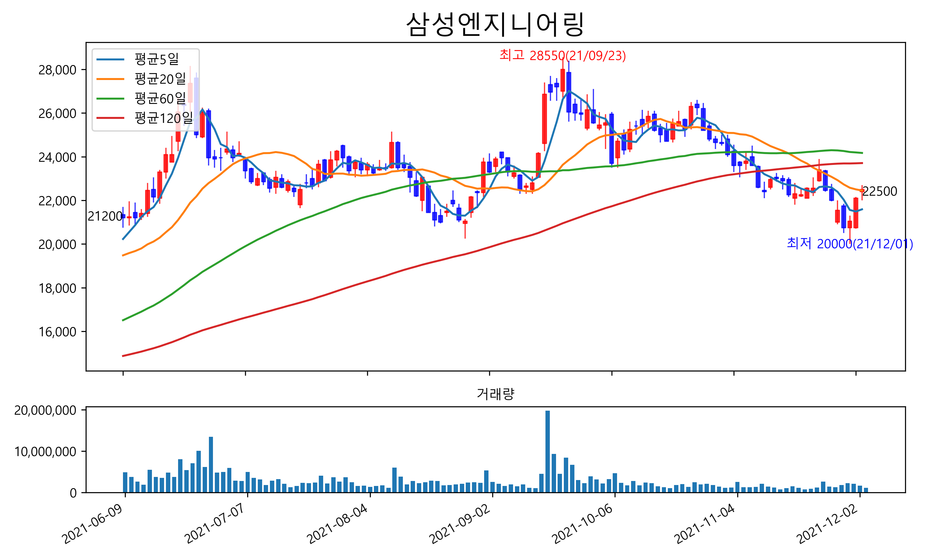 최근 6개월간 캔들차트 및 이동평균선입니다.