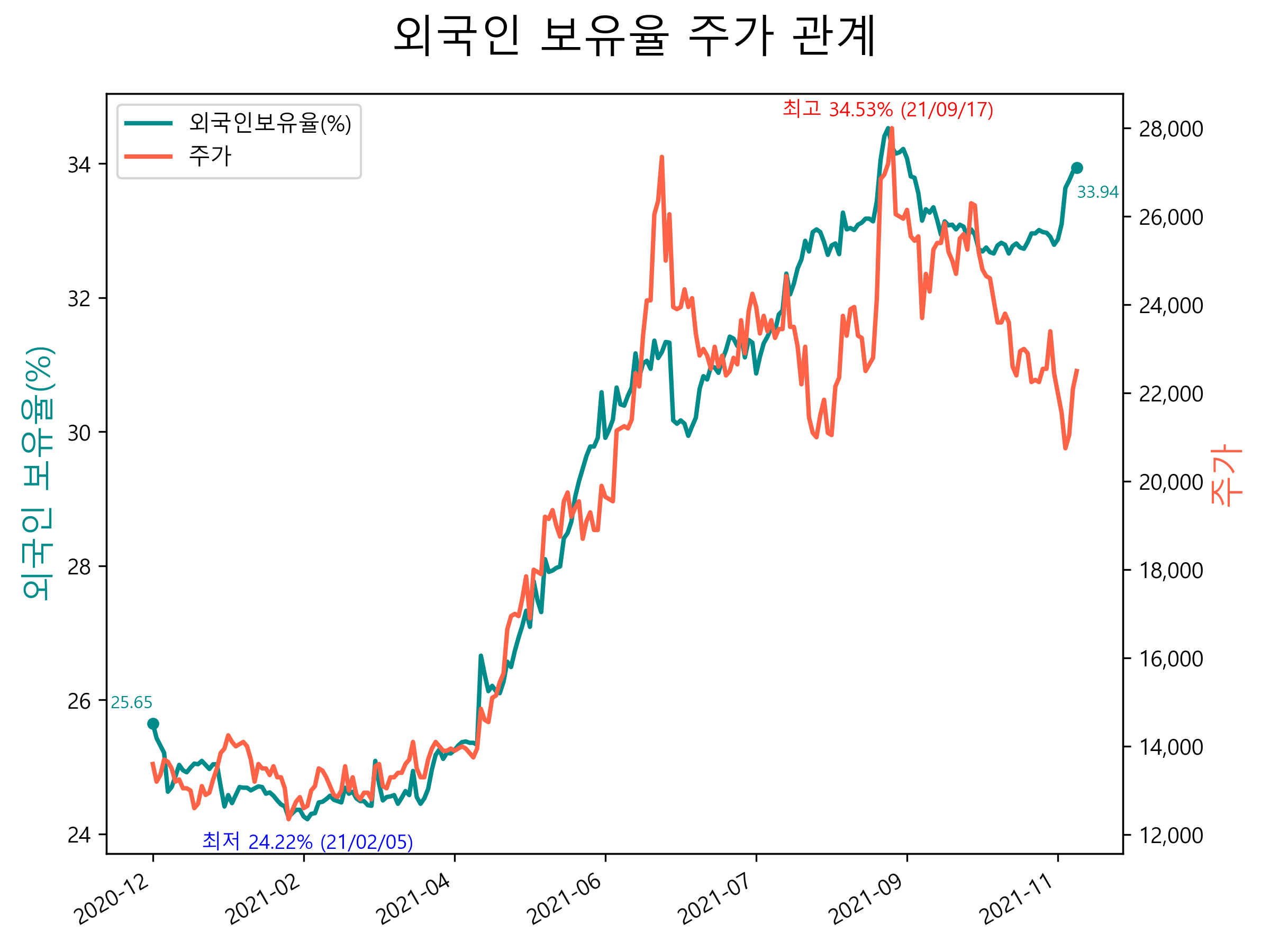 최근 1년간 외국인 보유율 및 주가와의 관계입니다.