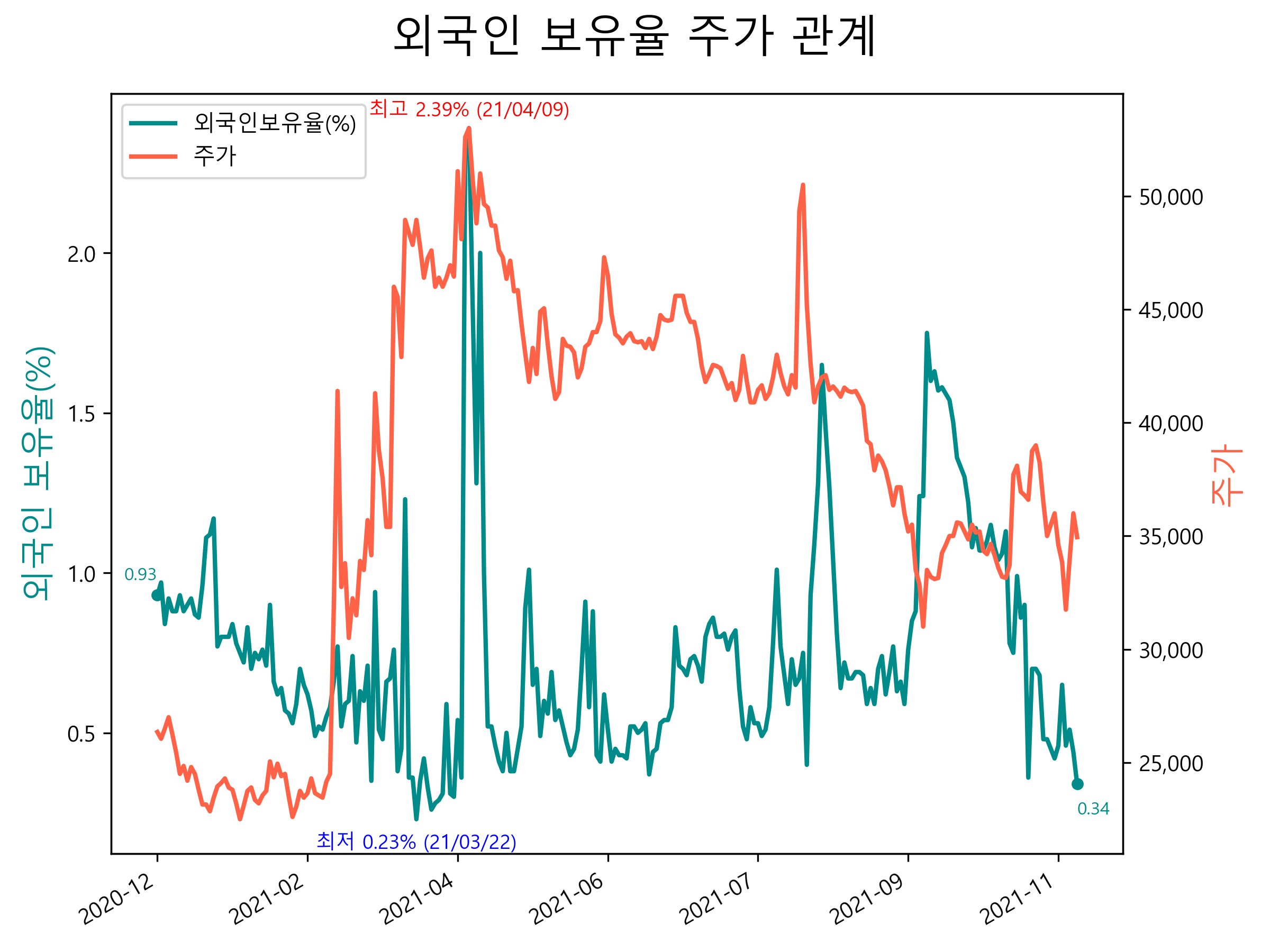 최근 1년간 외국인 보유율 및 주가와의 관계입니다.