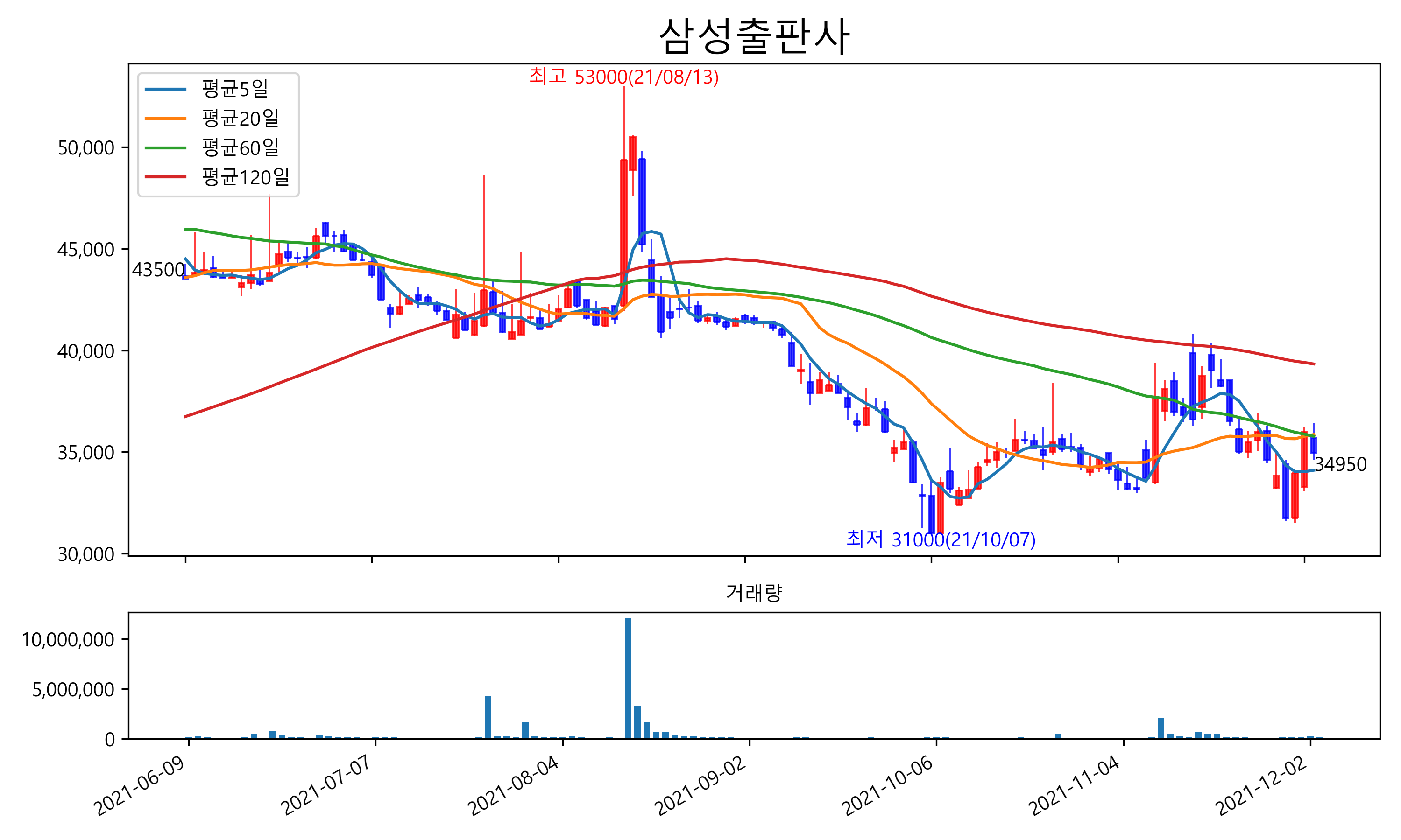 12월 6일 기준 주가는 34,950원 입니다. 아래는 최근 3년간의 주가흐름입니다.