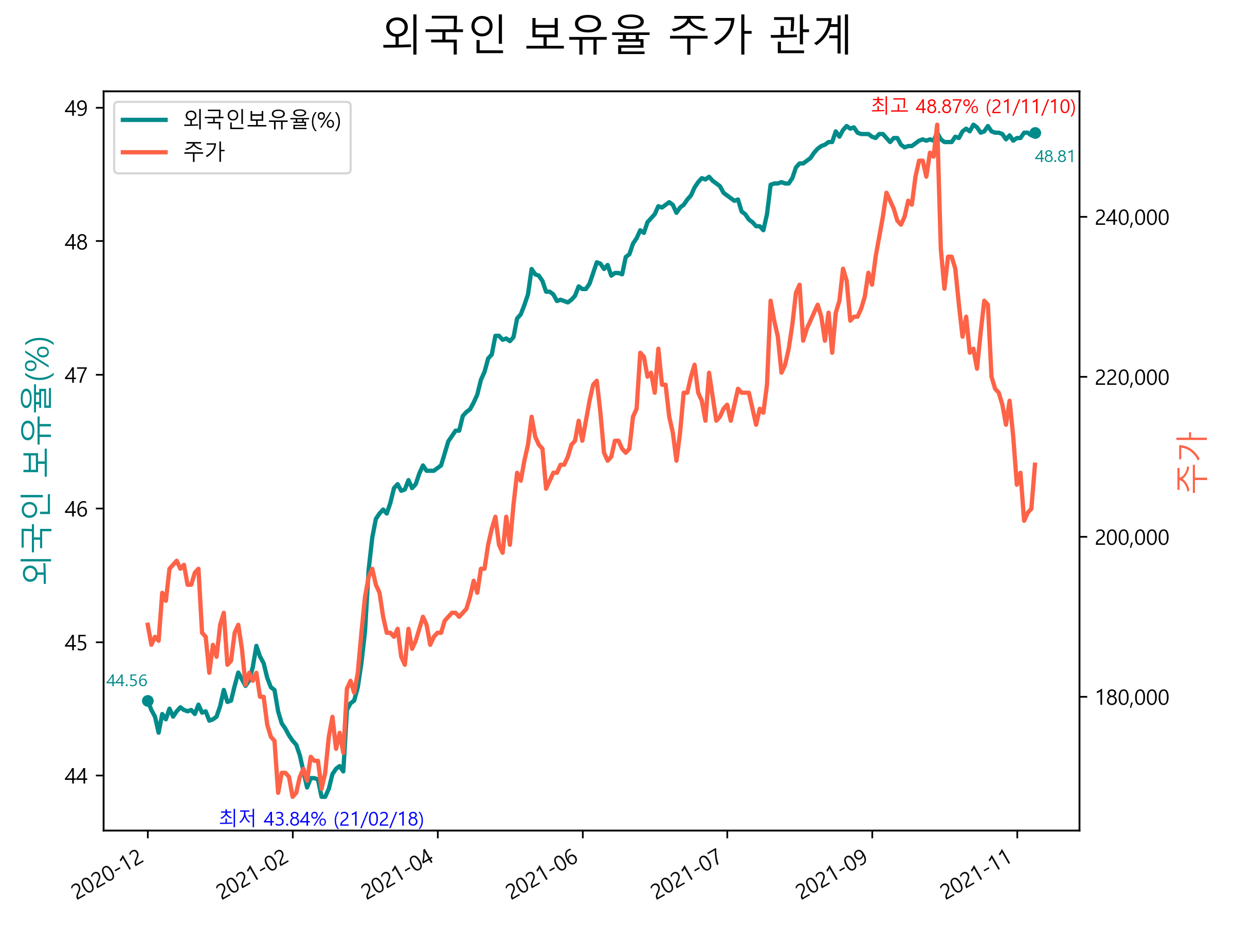 최근 1년간 외국인 보유율 및 주가와의 관계입니다.
