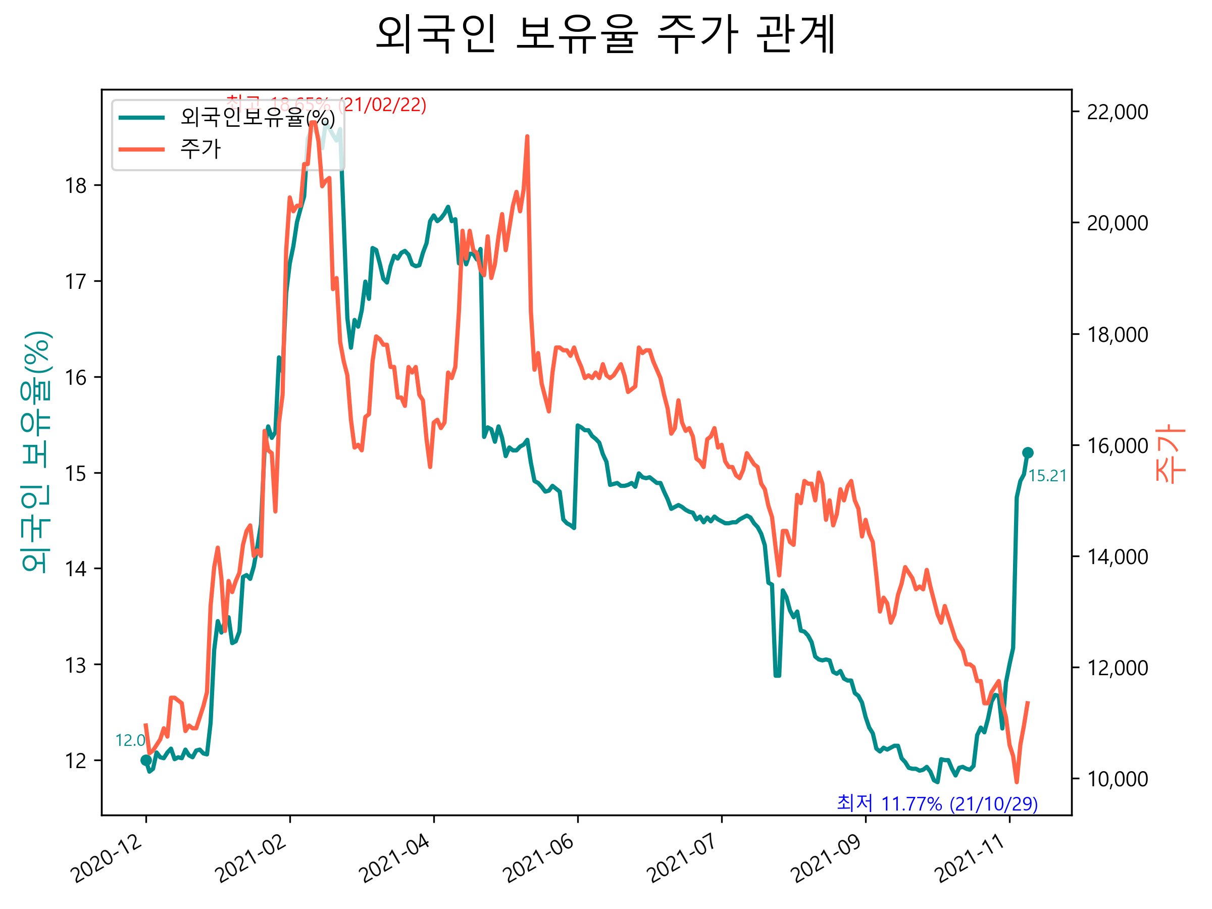 최근 1년간 외국인 보유율 및 주가와의 관계입니다.