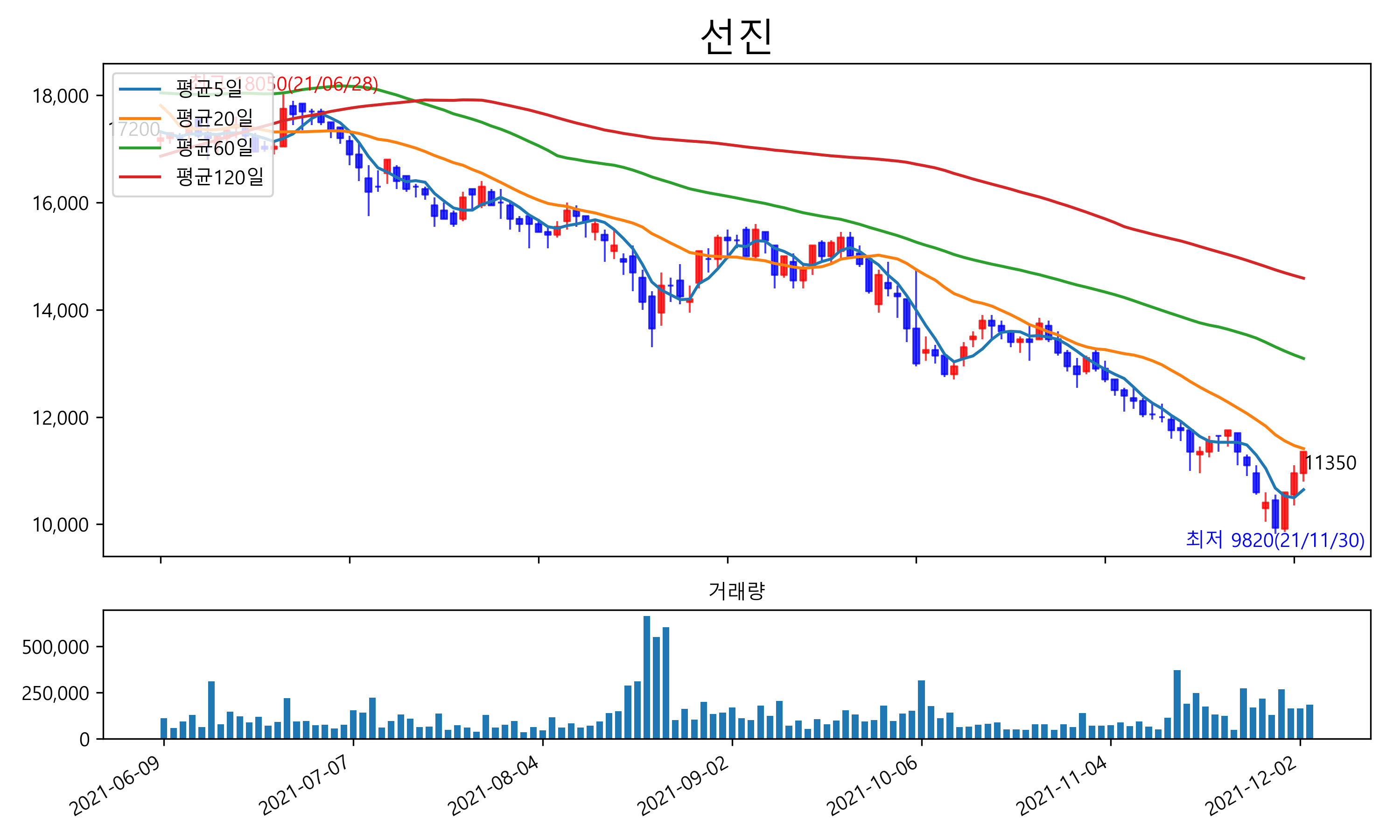 최근 6개월간 캔들차트 및 이동평균선입니다.