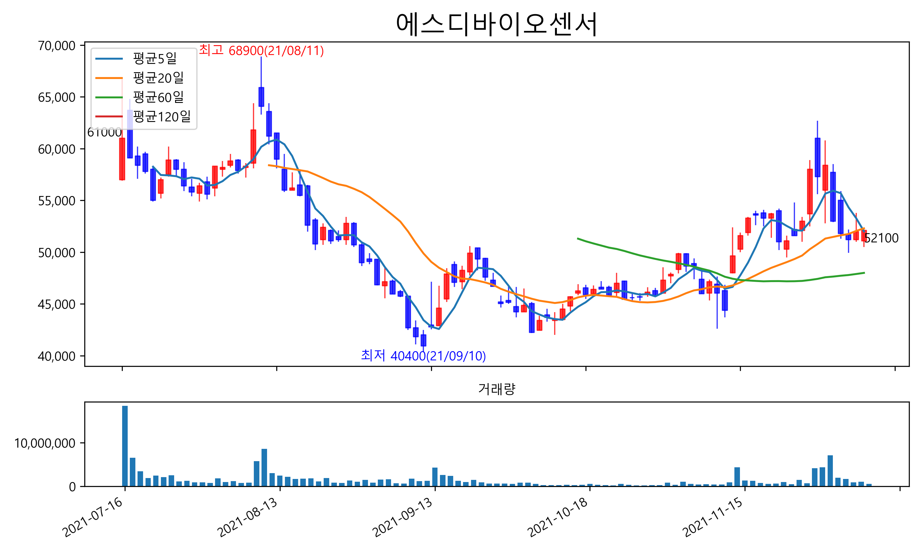 최근 6개월간 캔들차트 및 이동평균선입니다.