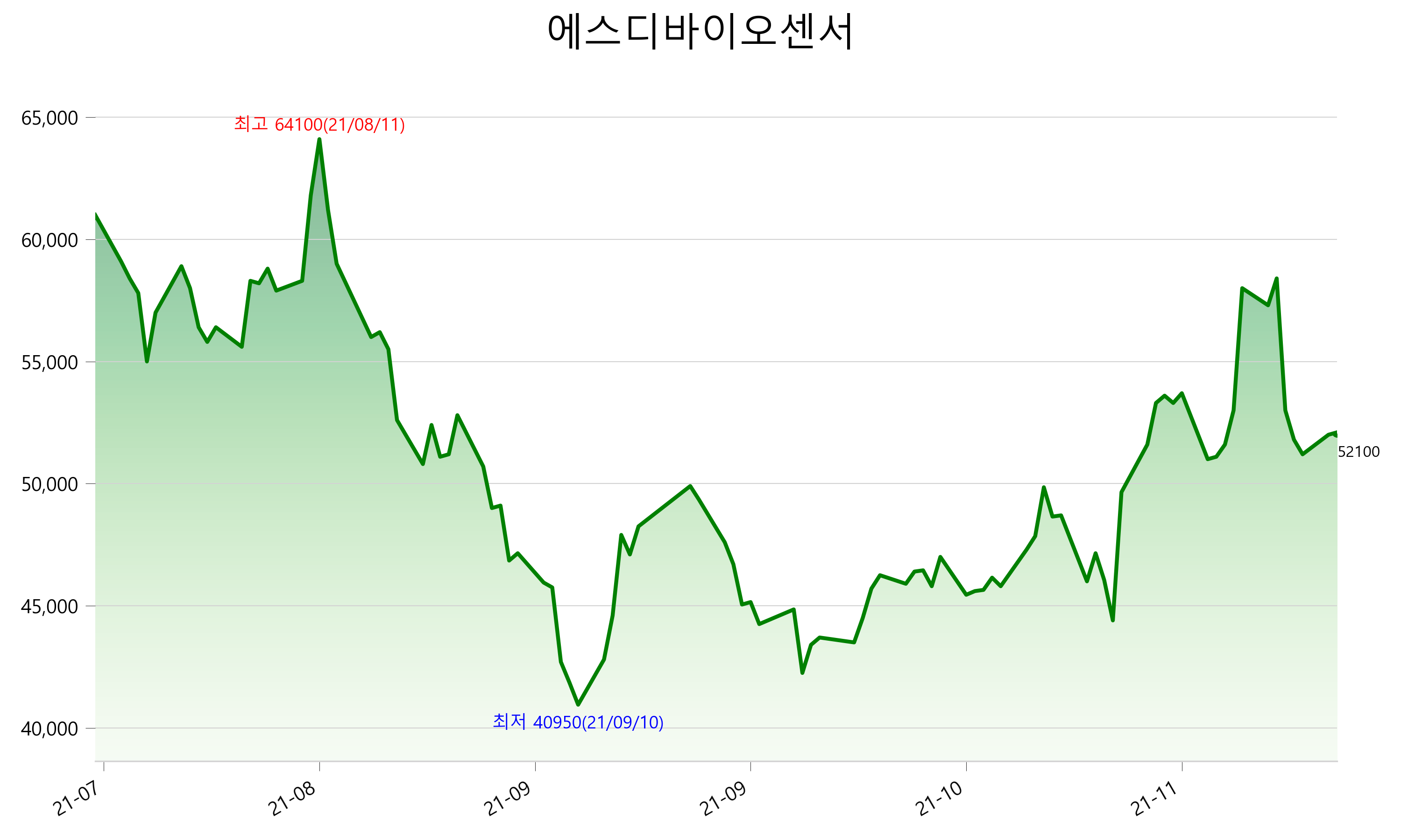 52주 최고가는 64,100원(2021-08-11), 52주 최저가는 40,950원(2021-09-10)으로 52주간 변동률은 -14.6% 입니다.