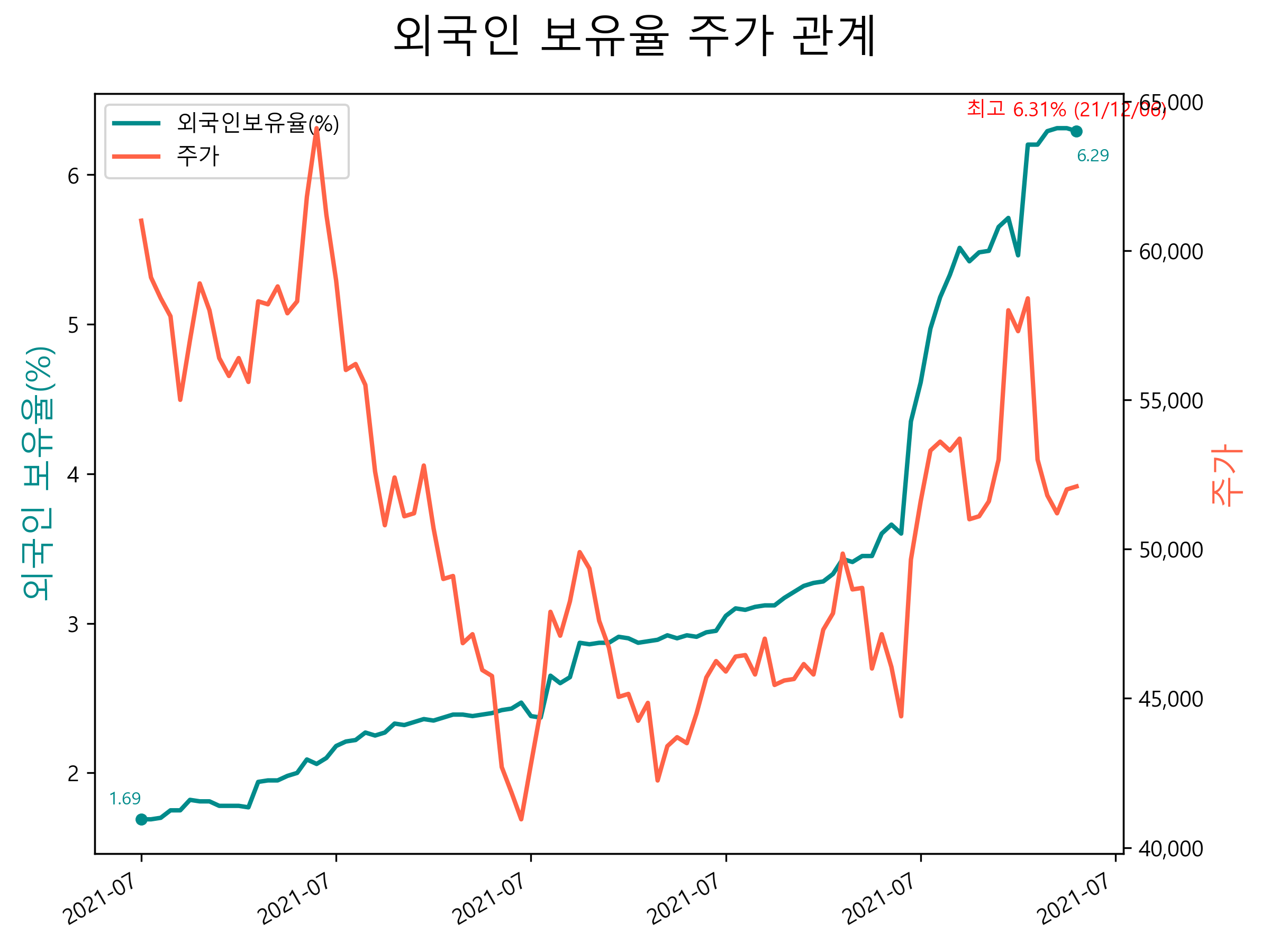 최근 1년간 외국인 보유율 및 주가와의 관계입니다.
