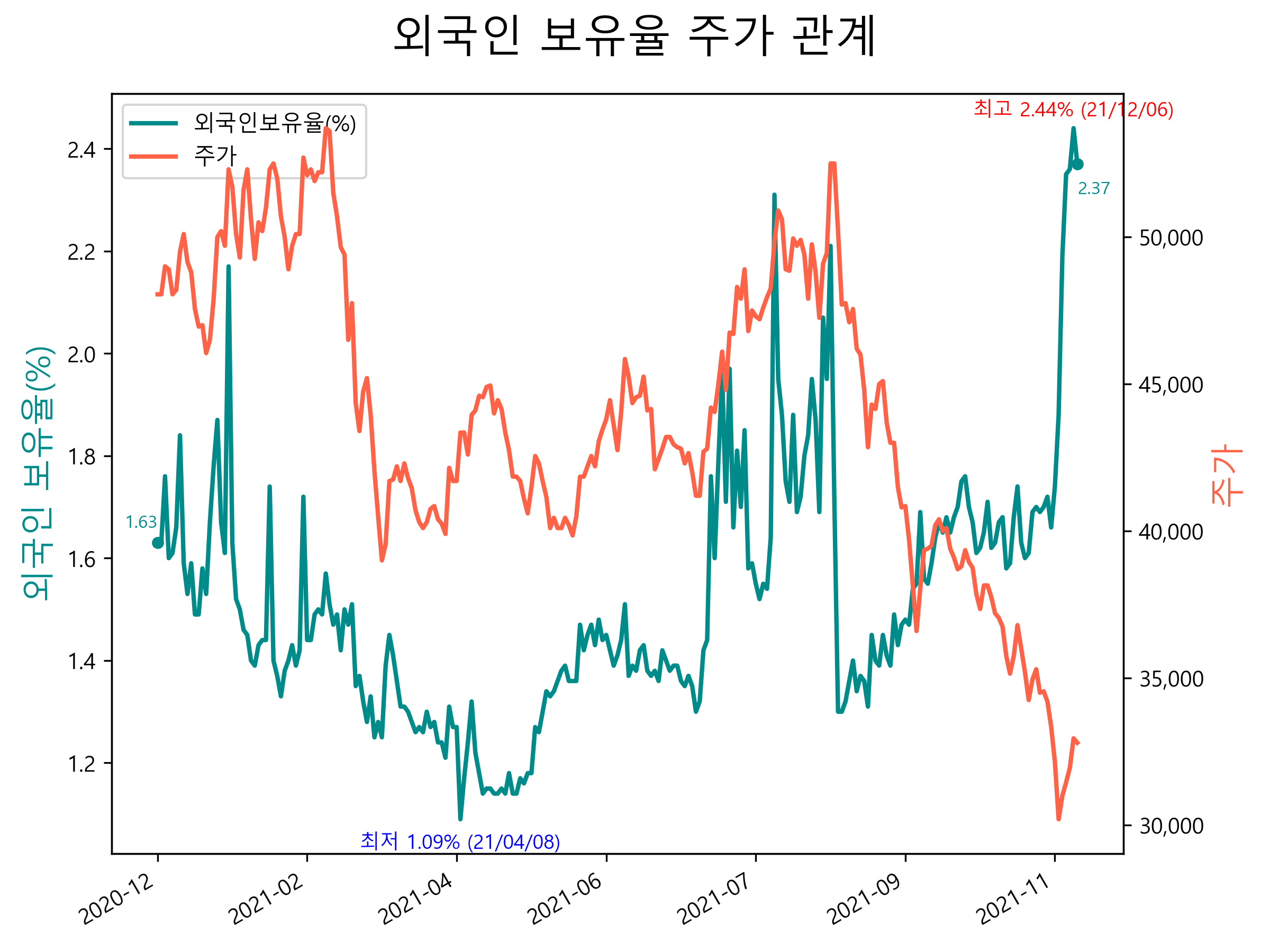 최근 1년간 외국인 보유율 및 주가와의 관계입니다.