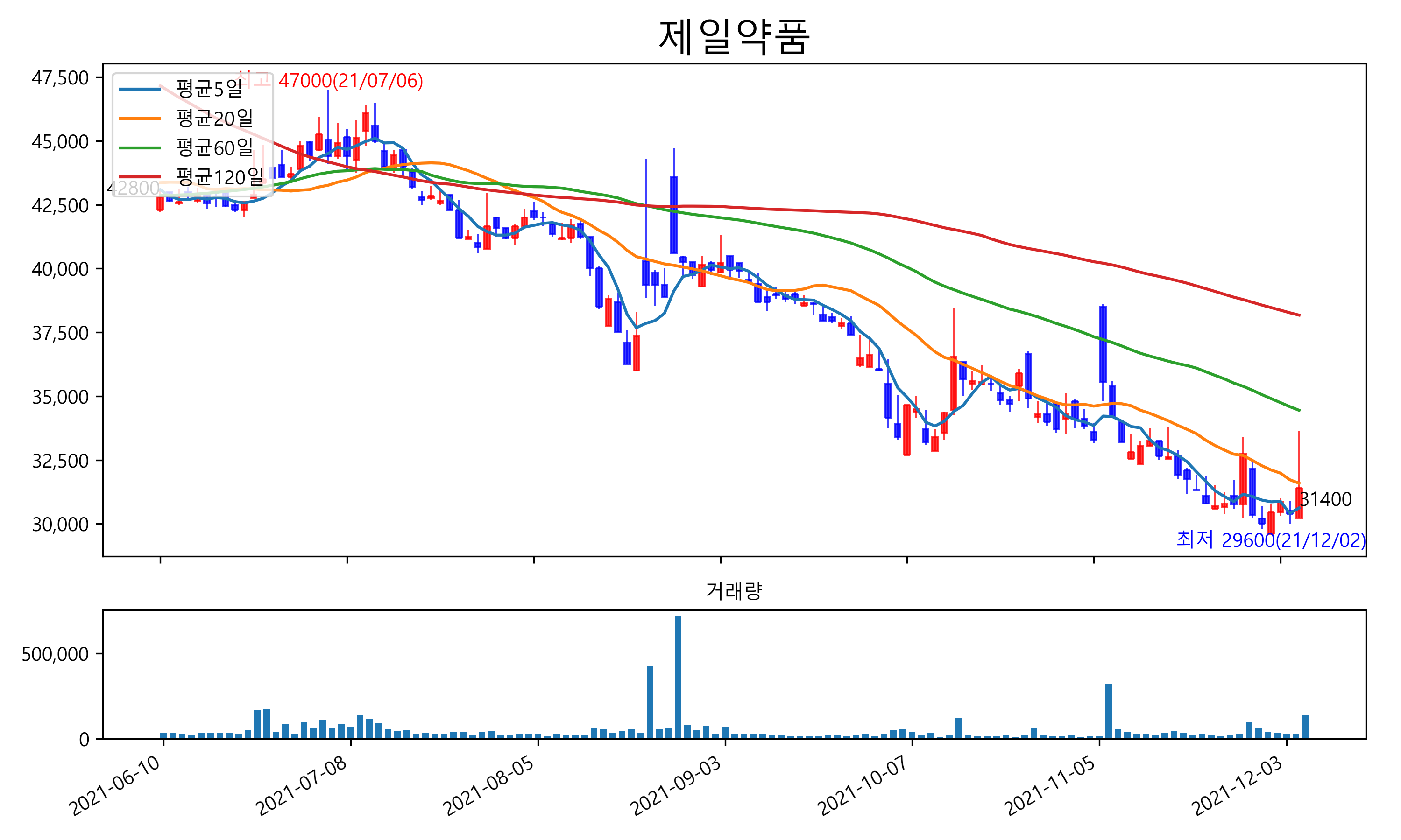 최근 6개월간 캔들차트 및 이동평균선입니다.