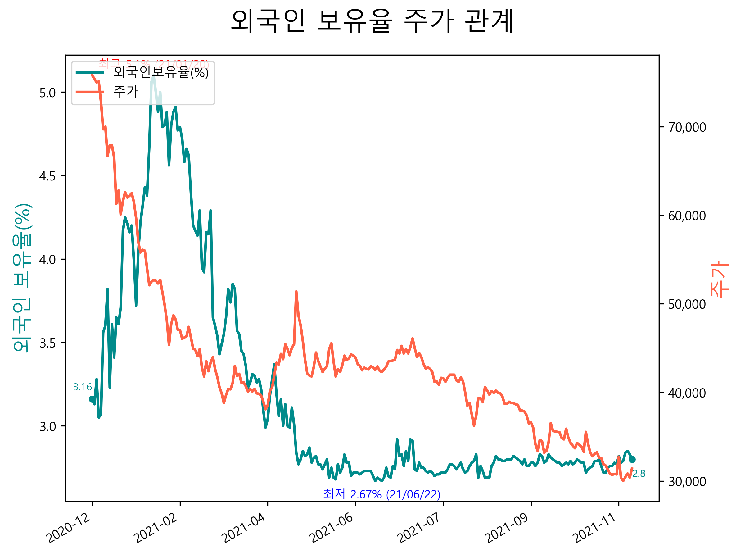 최근 1년간 외국인 보유율 및 주가와의 관계입니다.