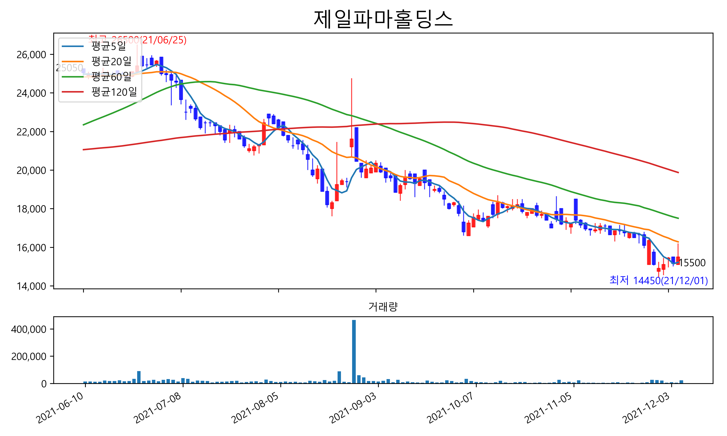 최근 6개월간 캔들차트 및 이동평균선입니다.