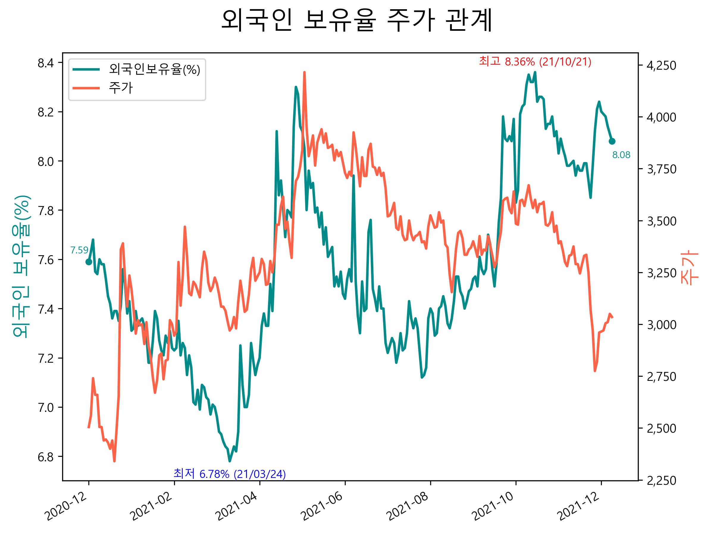 최근 1년간 외국인 보유율 및 주가와의 관계입니다.