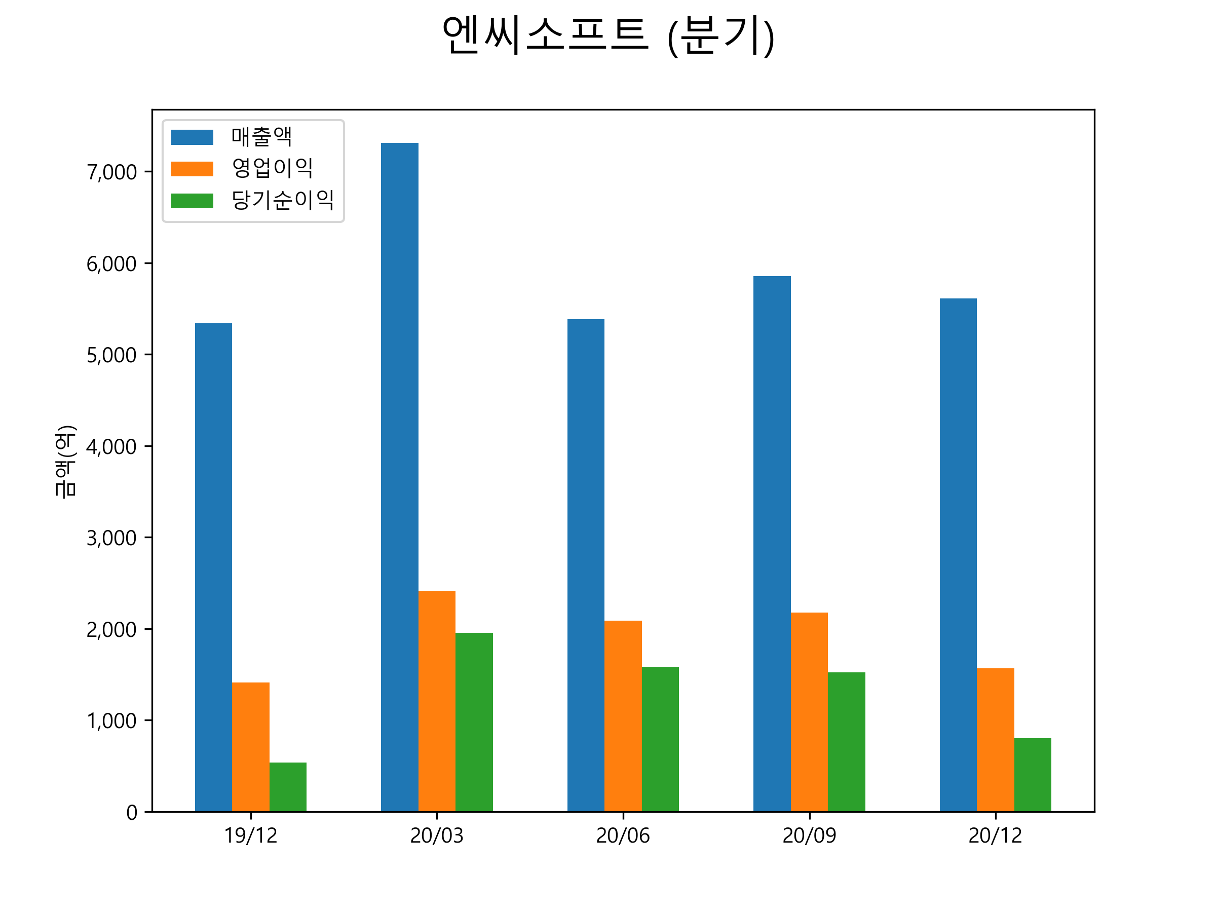 엔씨소프트의 2020년 4분기 매출은 5613억원, 영업이익 1567억원, 당기순이익 803억원을 기록했습니다. 엔씨소프트의 분기별 매출 및 영업이익, 당기순이익 표입니다.