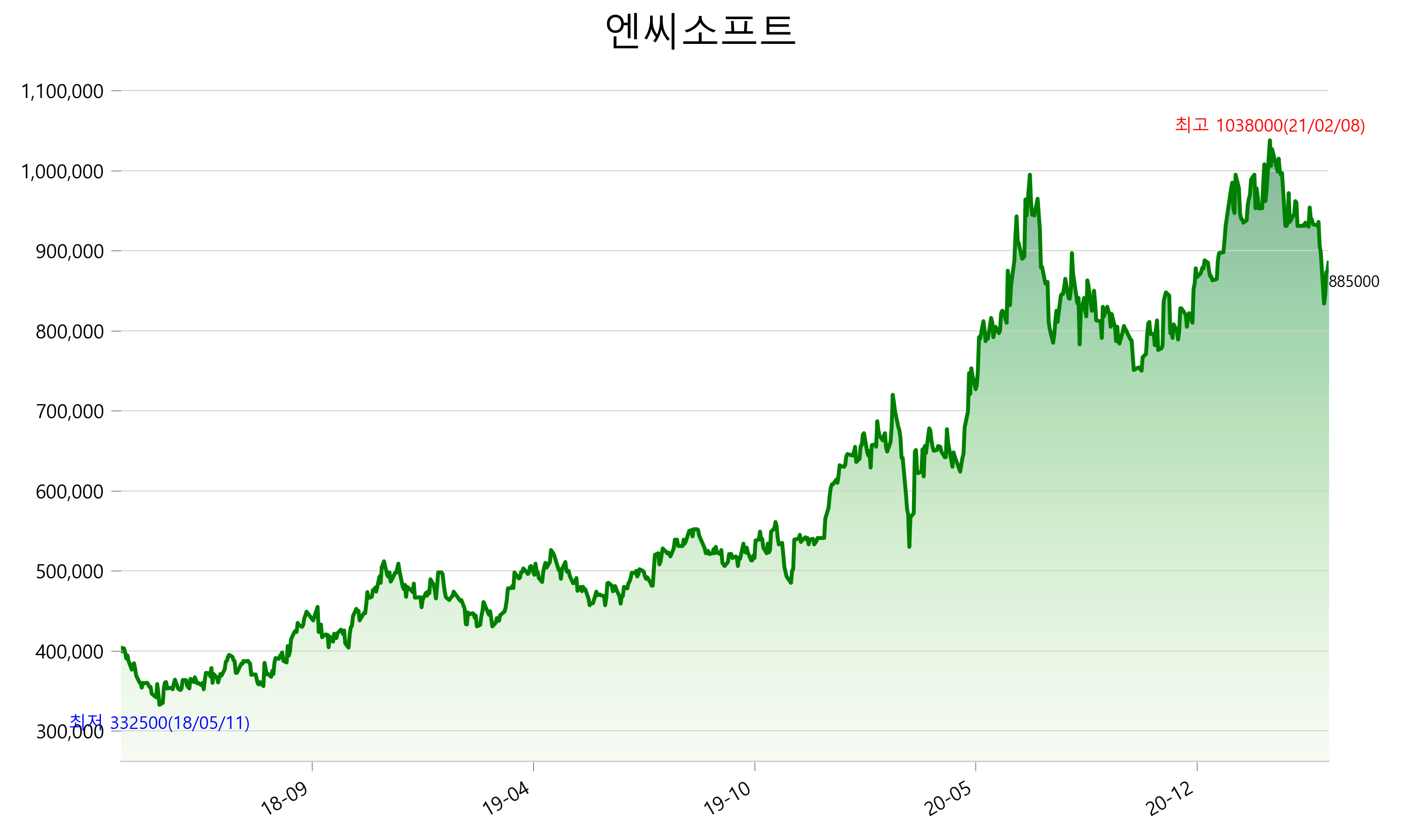 2021년 04월 04일 기준 주가는 885,000원 입니다. 아래는 최근 3년간의 주가흐름입니다.