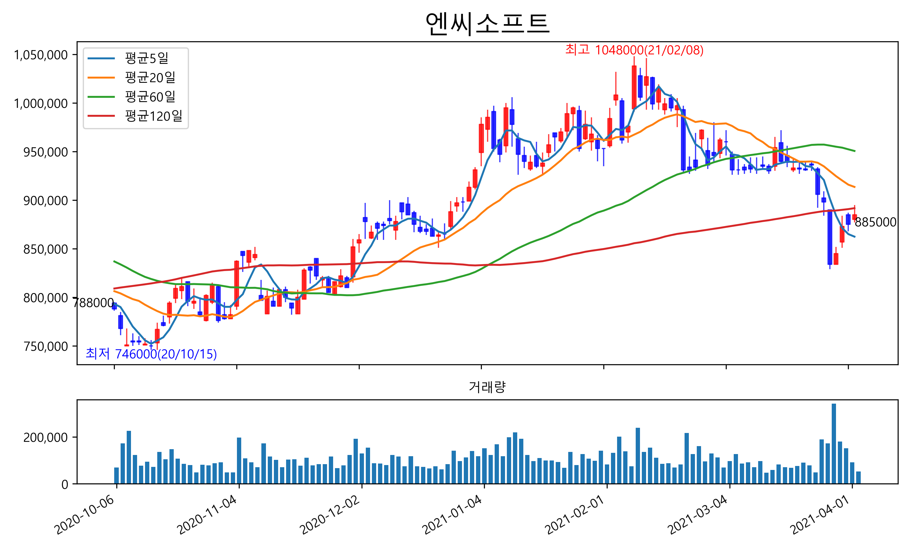 최근 6개월간 캔들차트 및 이동평균선입니다.
