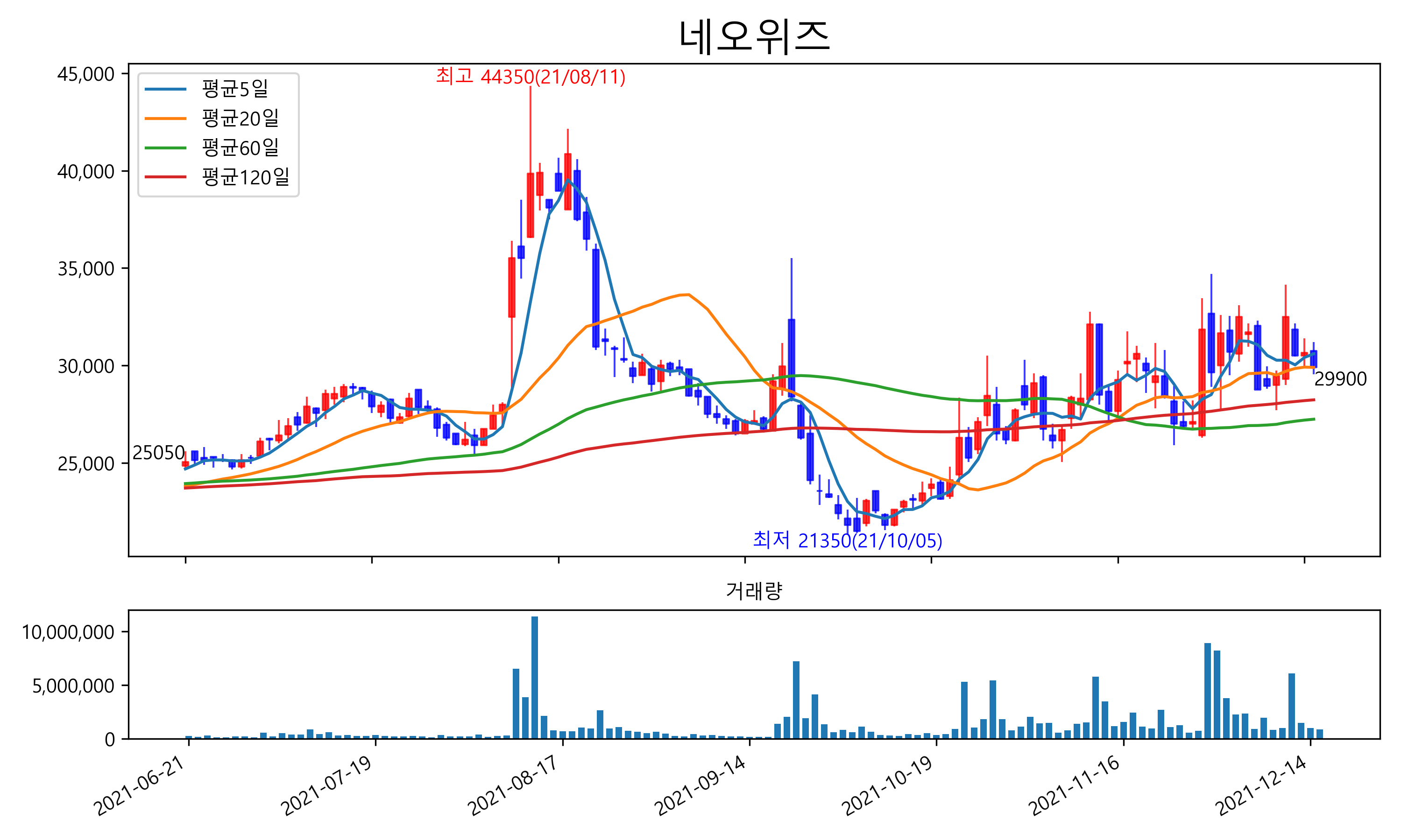 최근 6개월간 캔들차트 및 이동평균선입니다.