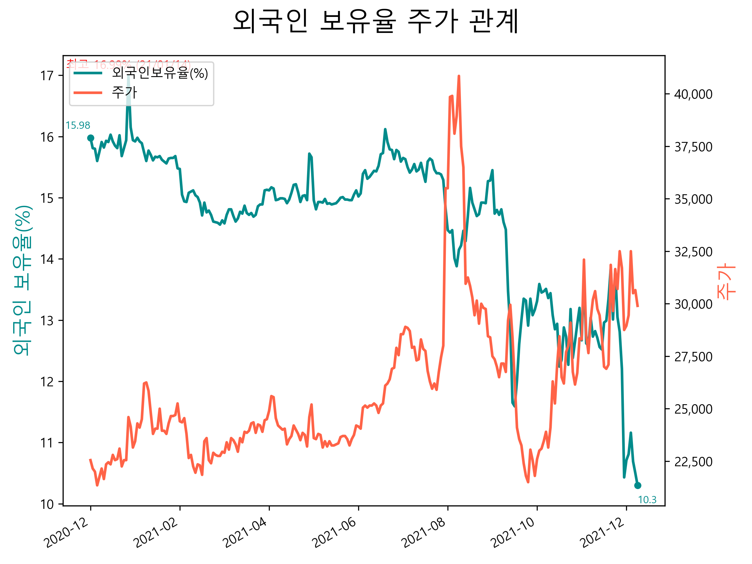 최근 1년간 외국인 보유율 및 주가와의 관계입니다.