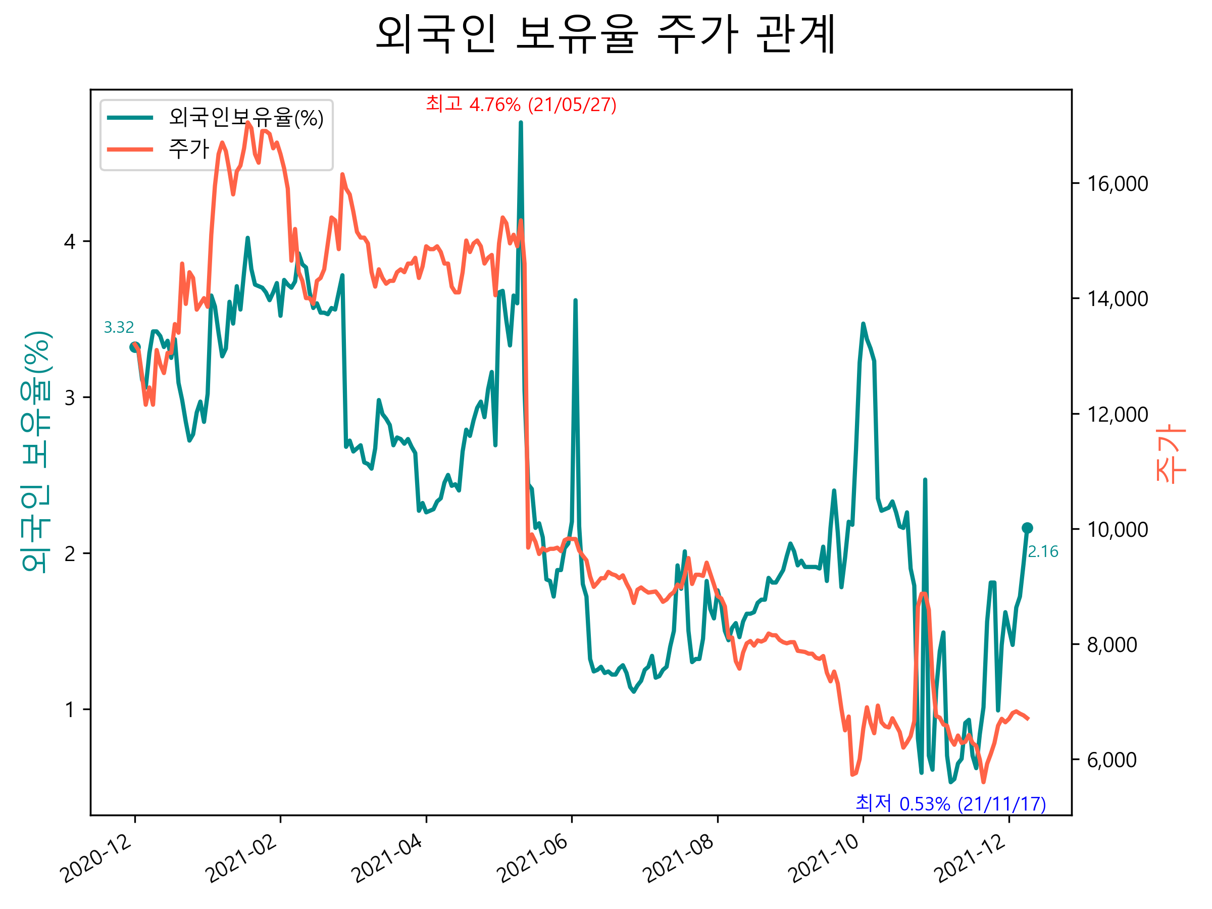최근 1년간 외국인 보유율 및 주가와의 관계입니다.