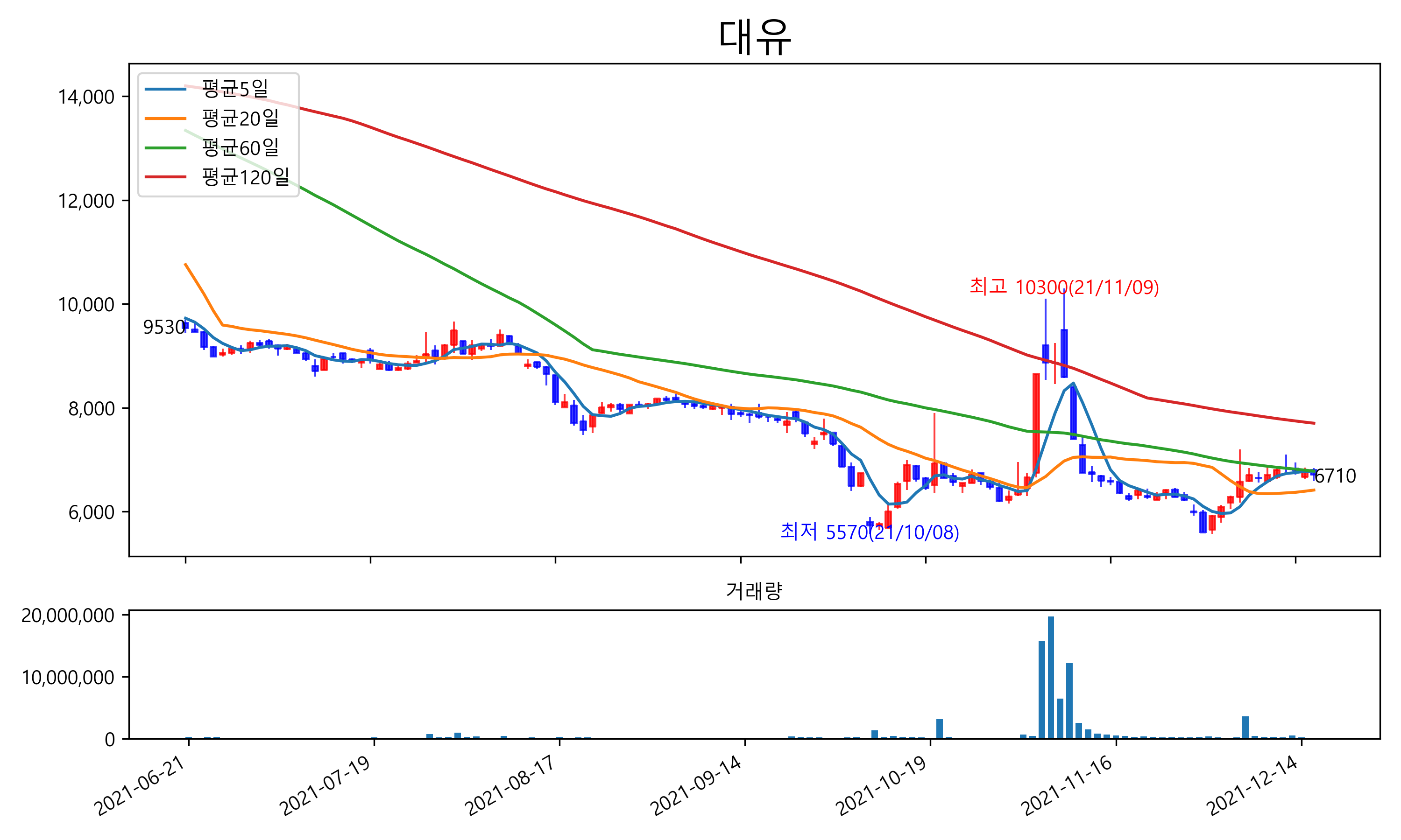 최근 6개월간 캔들차트 및 이동평균선입니다.