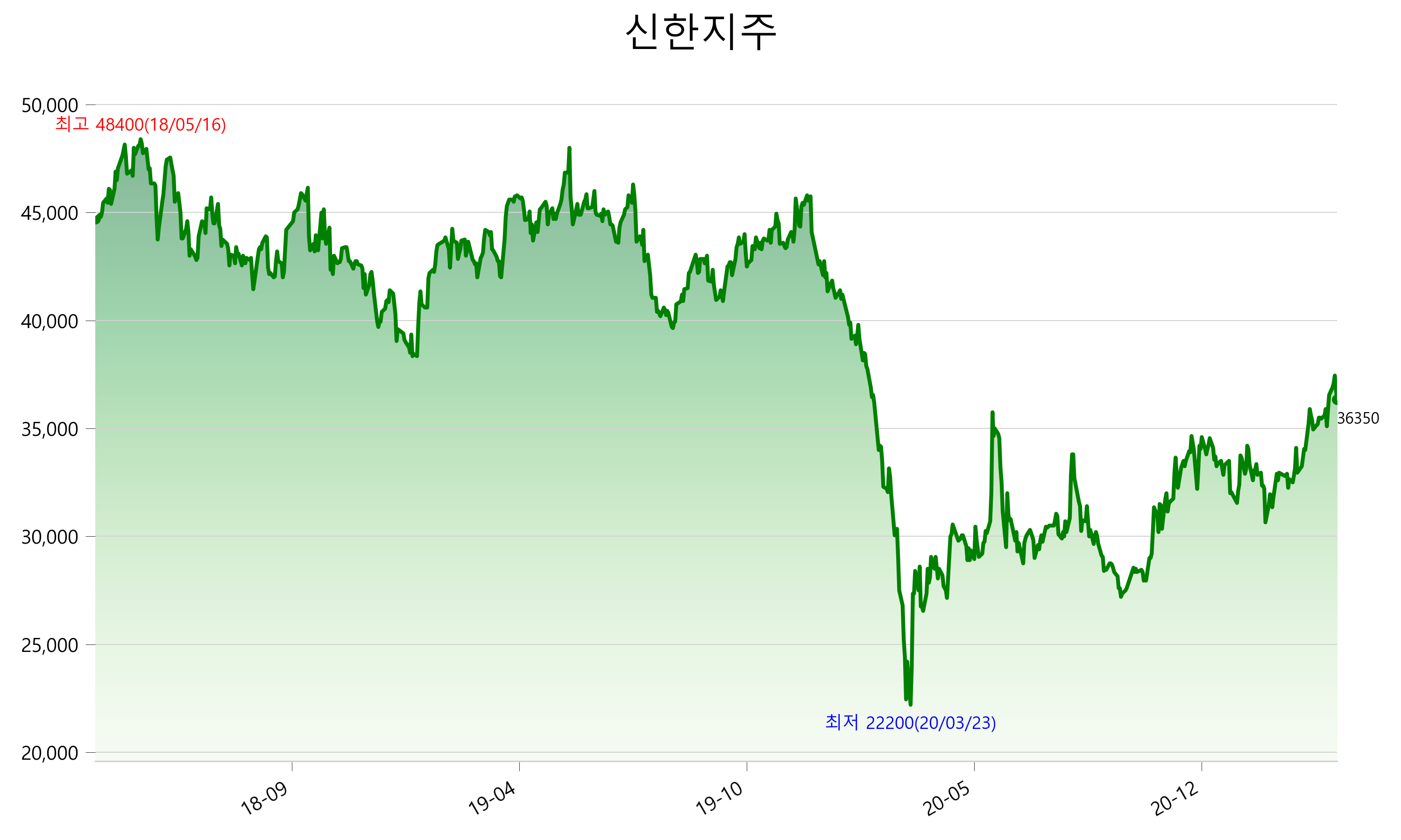 2021년 04월 04일 기준 주가는 36,350원 입니다. 아래는 최근 3년간의 주가흐름입니다.