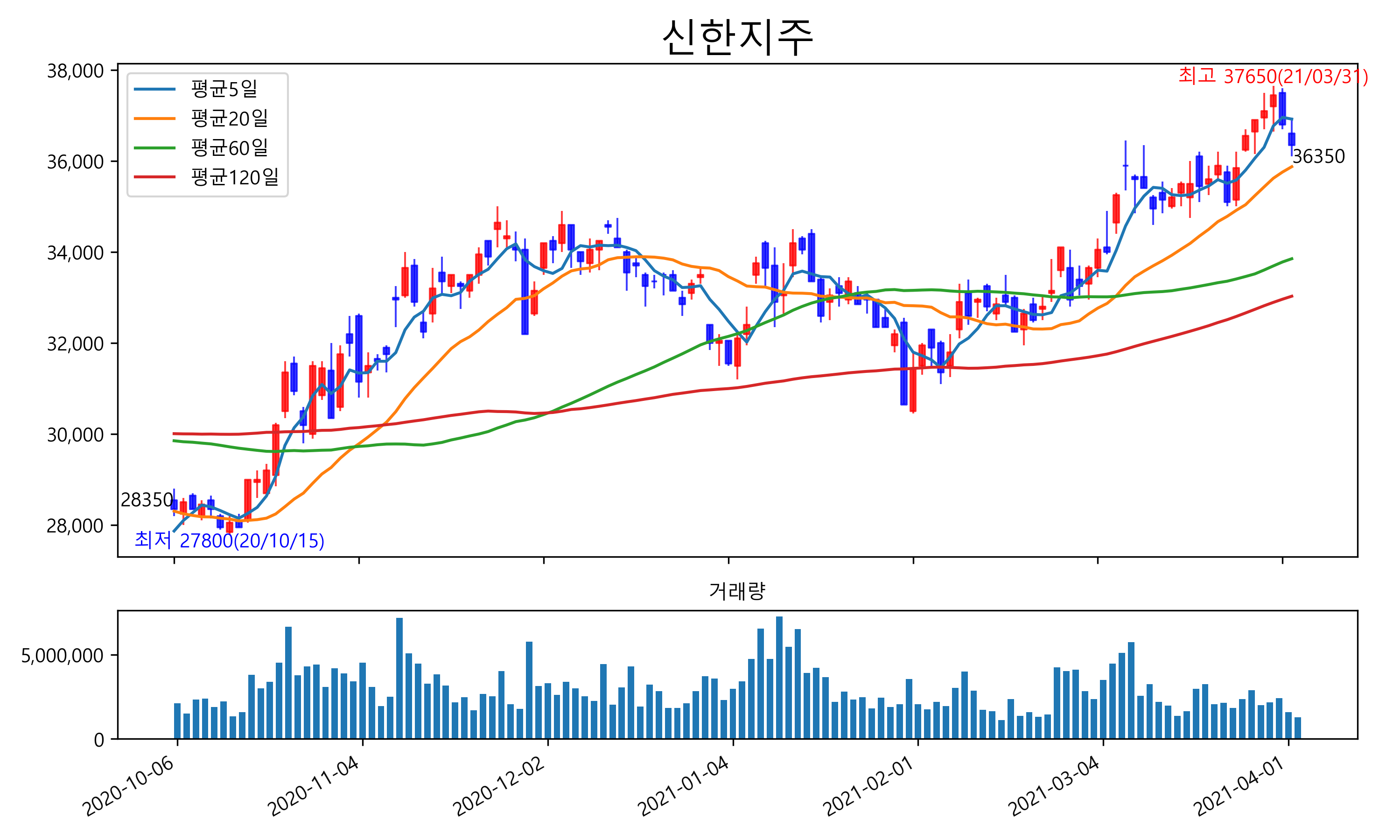 최근 6개월간 캔들차트 및 이동평균선입니다.
