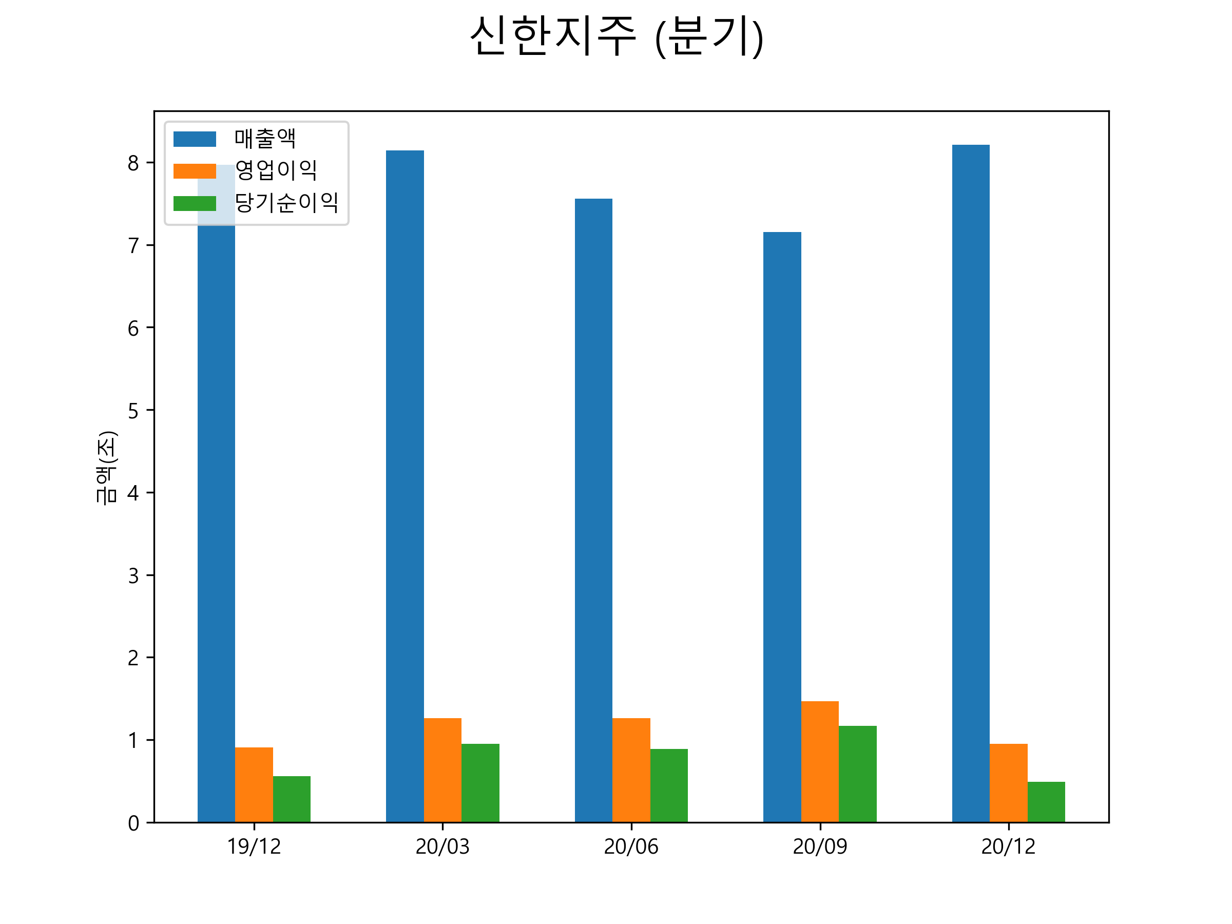 신한지주의 2020년 4분기 매출은 8조 2053억원, 영업이익 9490억원, 당기순이익 4894억원을 기록했습니다. 신한지주의 분기별 매출 및 영업이익, 당기순이익 표입니다.