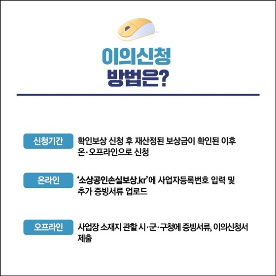 - 오프라인 사업장 소재지 관할 시·군·구청에 증빙서류, 이의신청서 제출