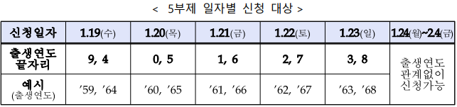 신청 첫날인 1.19일(수)은 출생연도 끝자리가 9 또는 4, 1.20일(목)에는 0 또는 5인 경우 신청할 수 있으며, 1.24일(월)부터 2.4일(금)까지는 출생연도 끝자리와 관계없이 신청할 수 있습니다.