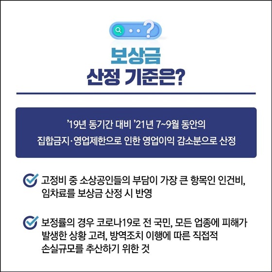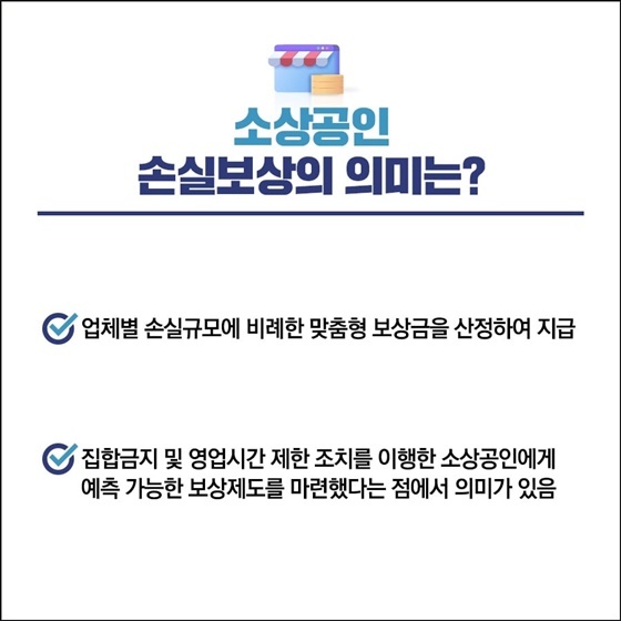 - 업체별 손실규모에 비례한 맞춤형 보상금을 산정하여 지급 - 집합금지 및 영업시간 제한 조치를 이행한 소상공인에게 예측 가능한 보상제도를 마련했다는 점에서 의미가 있음