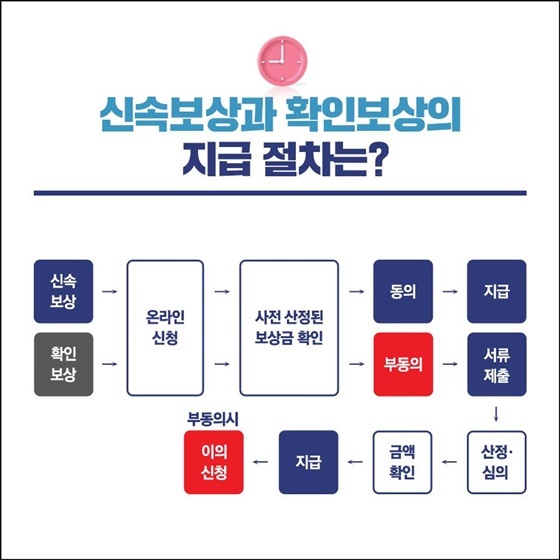 - 신속보상 온라인 신청 → 사전 산정된 보상금 확인 → 동의 → 지급 → 서류제출 → 산정·심의 → 금액 확인→ 지급 → 부동의시 이의신청
