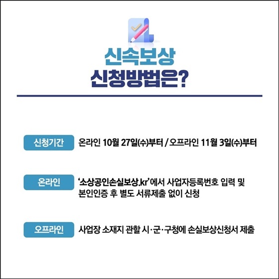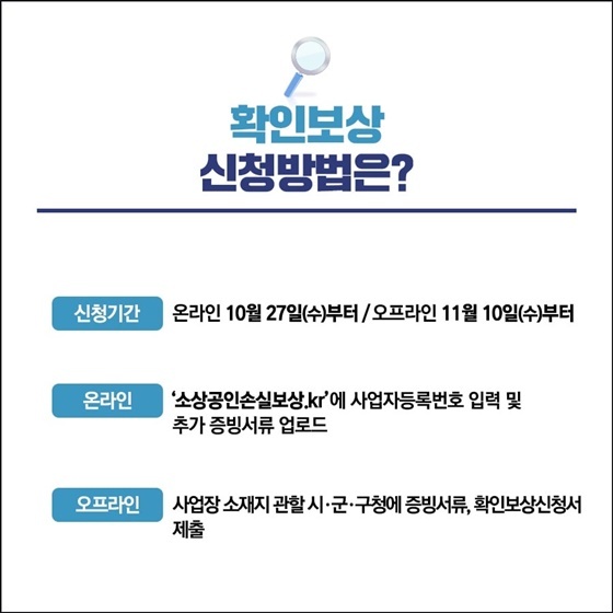 - 온라인 ‘소상공인손실보상.kr’에 사업자등록번호 입력 및 추가 증빙서류 업로드