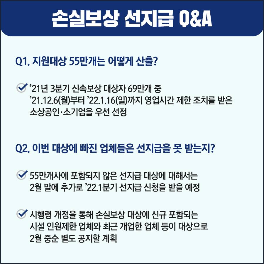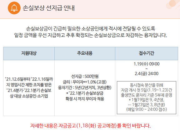 이번 선지급 대상인 55만개사 이외에 ①새롭게 손실보상 대상이 되는 ‘시설 인원제한 업체’와 ②’22.1월에 영업시간 제한을 이행하여 손실보상 대상으로 추가 확인되는 업체(2월 중순 공지 예정)는 ’22.2월말에 1분기 선지급금 250만원을 신청할 수 있습니다.