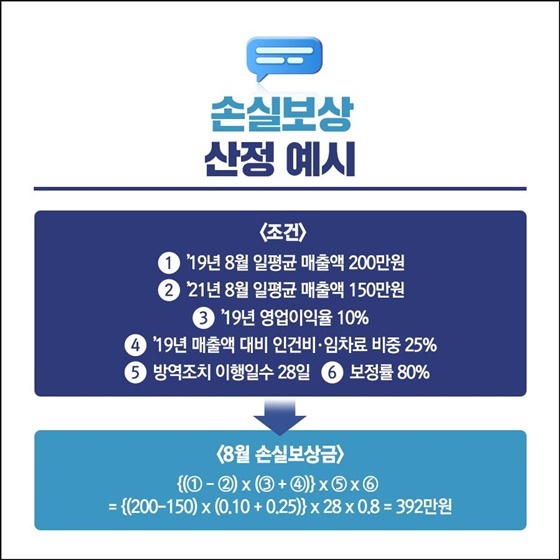 일평균 손실액 X 방역조치 이행일수 X 보정률 * 일평균 손실액 : ’19년 대비 ’21년 동월 일평균 매출감소액 X (’19년 영업이익률 + ’19년 매출액 대비 인건비·임차료 비중)
