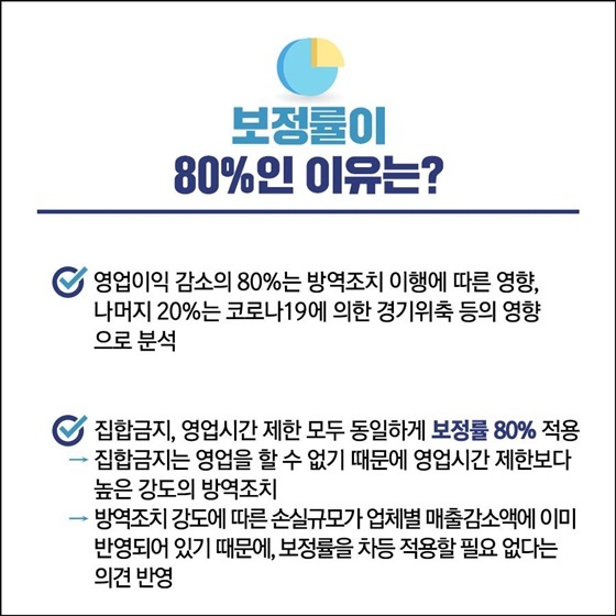 - 집합금지, 영업시간 제한 모두 동일하게 보정률 80% 적용 → 집합금지는 영업을 할 수 없기 때문에 영업시간 제한보다 높은 강도의 방역조치 → 방역조치 강도에 따른 손실규모가 업체별 매출감소액에 이미 반영되어 있기 때문에, 보정률을 차등 적용할 필요 없다는 의견 반영