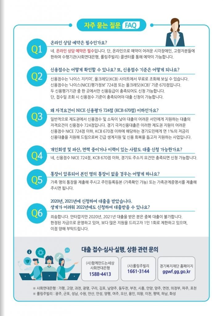 - 온라인에서 사전 상담 접수 예약 후 필요서류 지참하여 경기도 서민금융복지지원센터 방문