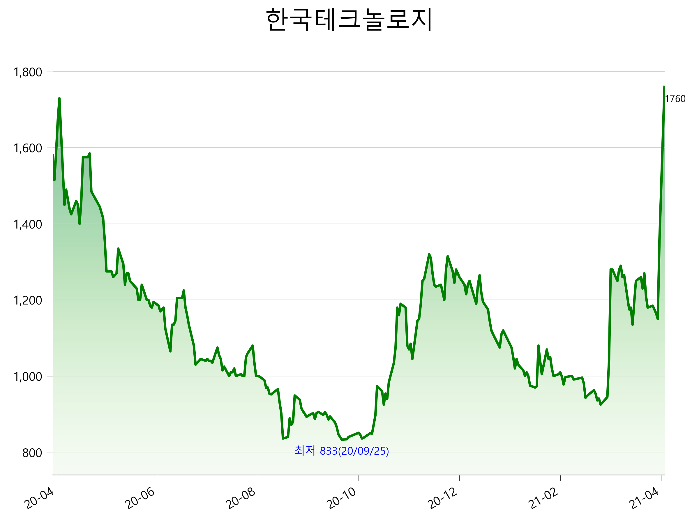 52주 최고가는 1,760원(2021-04-05), 52주 최저가는 833원(2020-09-25)으로 52주간 주가 상승률은 11.4% 입니다.