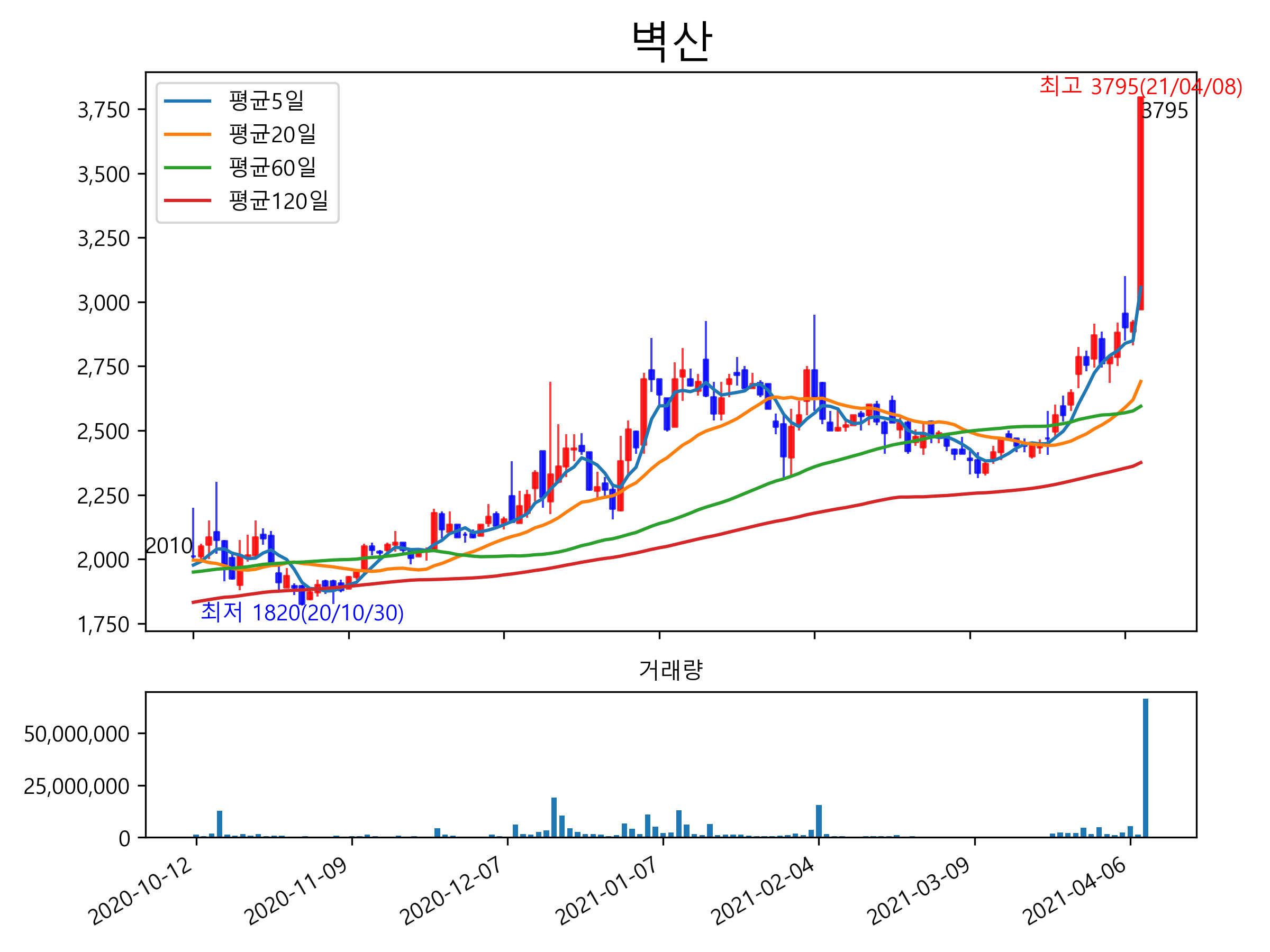 최근 6개월간 캔들차트 및 이동평균선입니다.