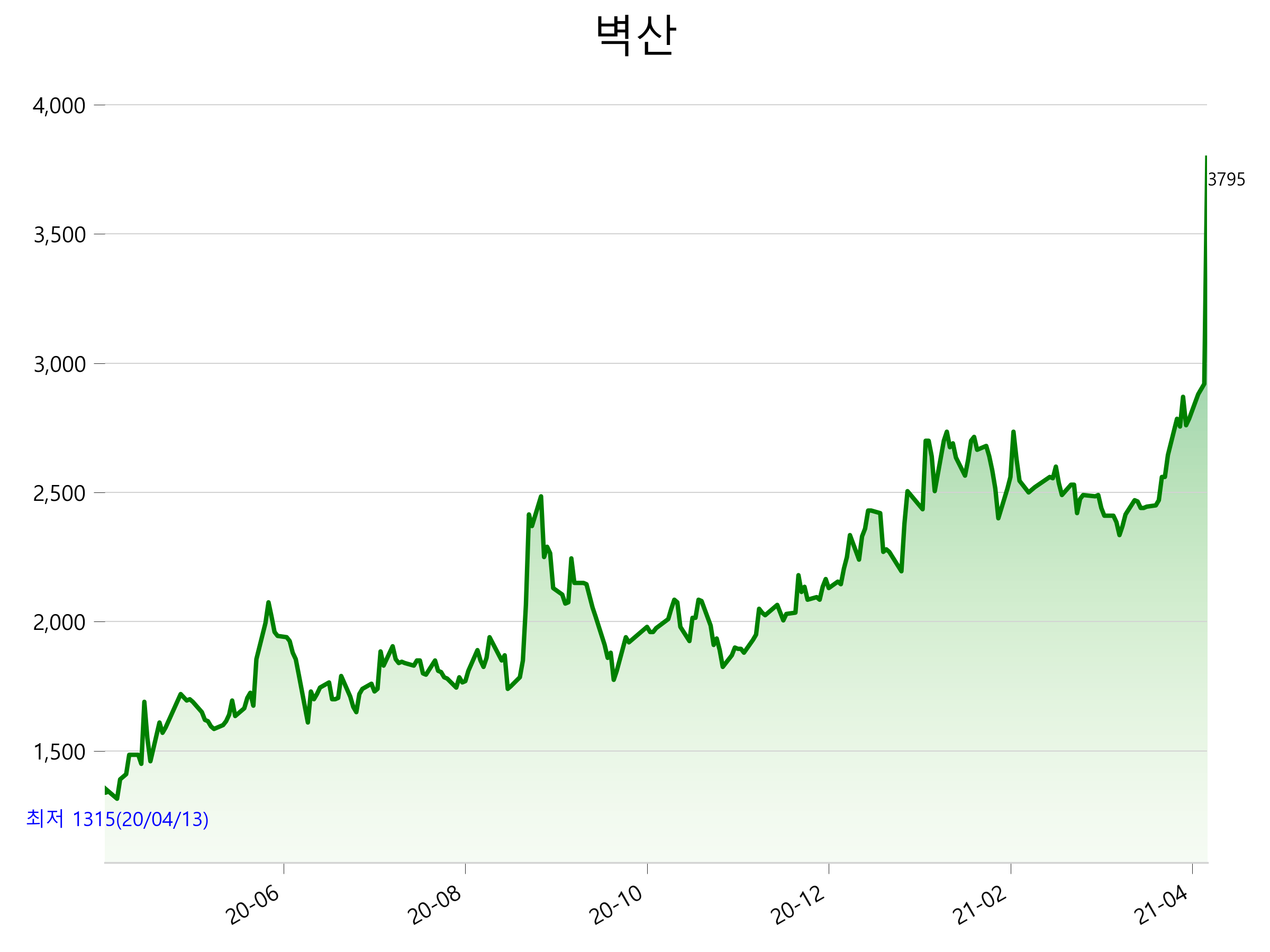 52주 최고가는 3,795원(2021-04-08), 52주 최저가는 1,315원(2020-04-13)으로 52주간 주가 상승률은 180.1% 입니다.