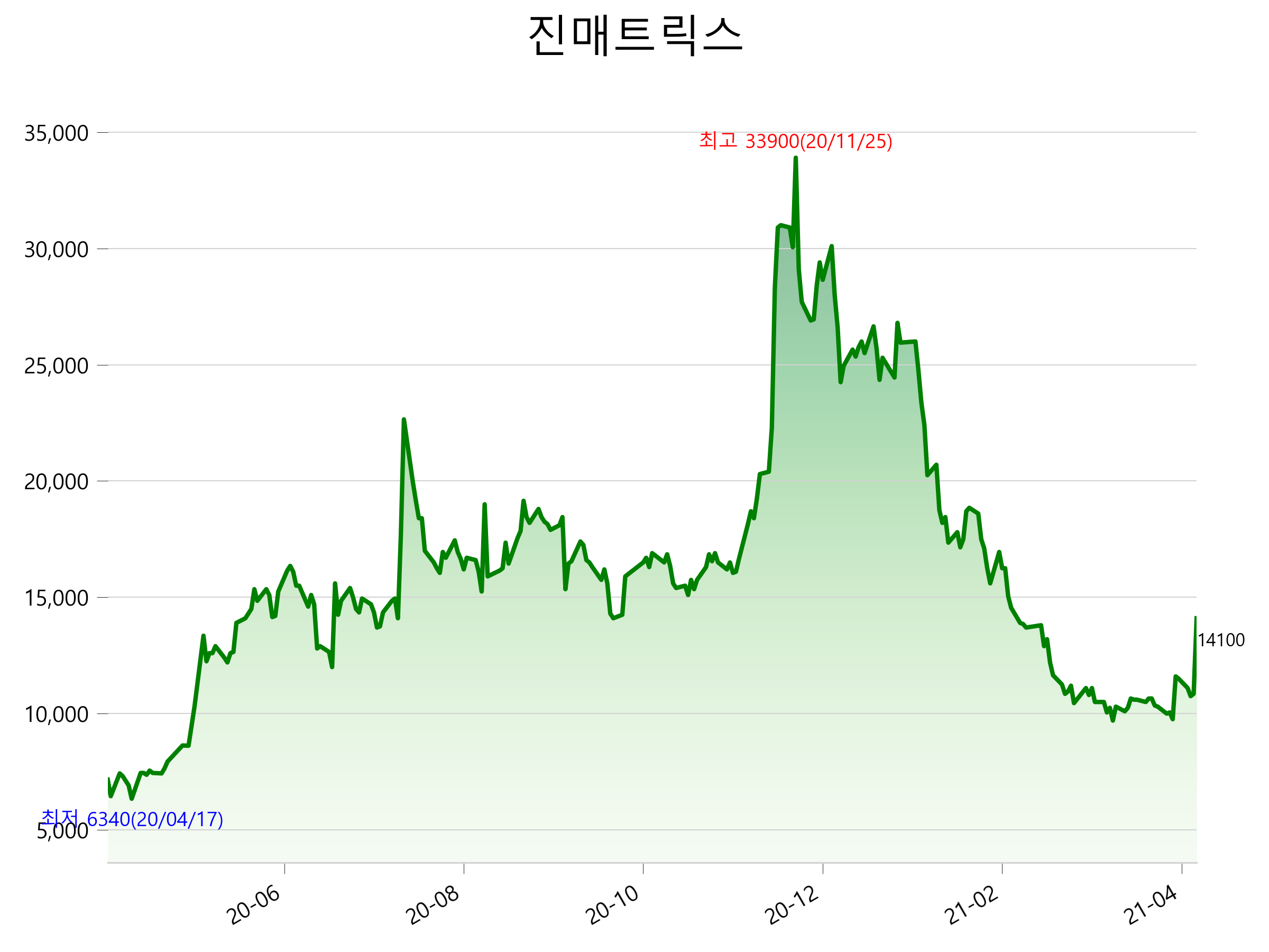 52주 최고가는 33,900원(2020-11-25), 52주 최저가는 6,340원(2020-04-17)으로 52주간 주가 상승률은 96.9% 입니다.