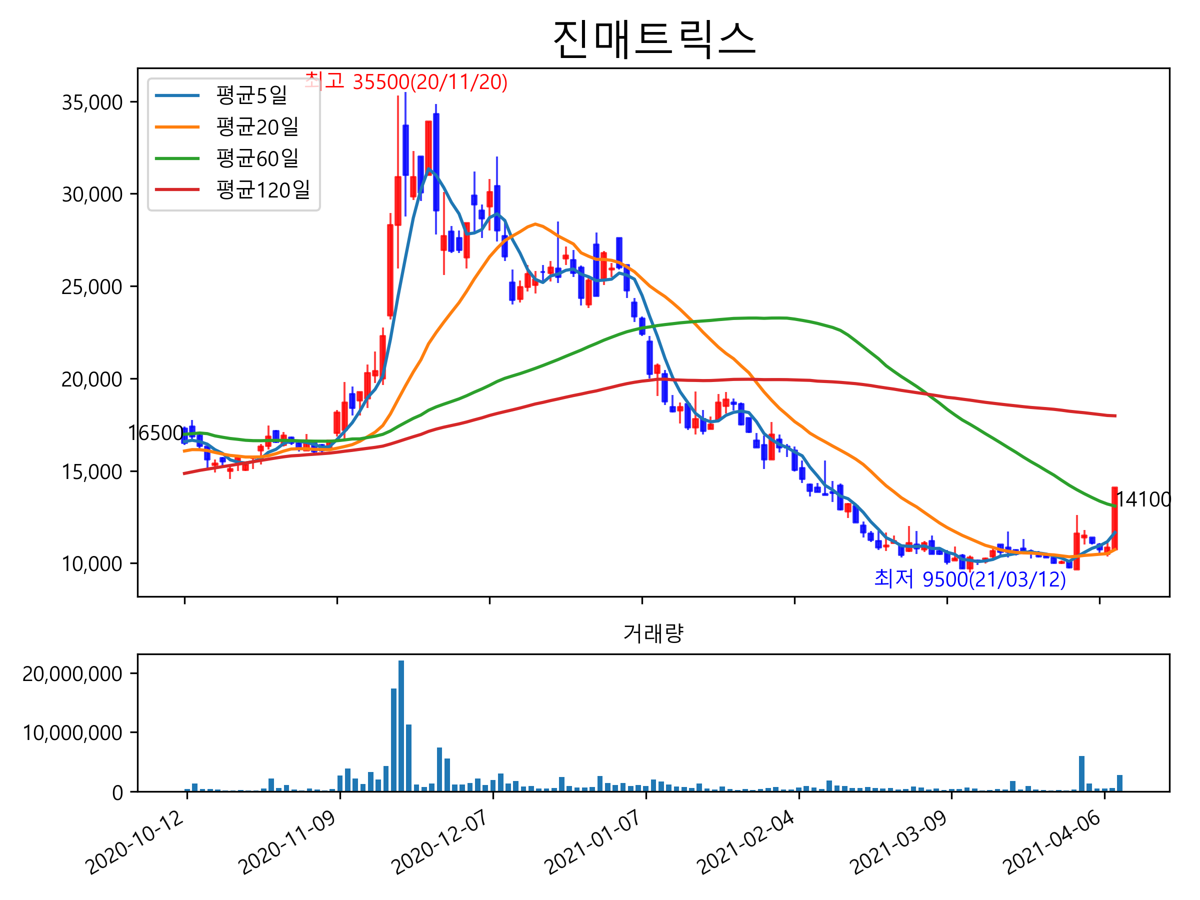 최근 6개월간 캔들차트 및 이동평균선입니다.