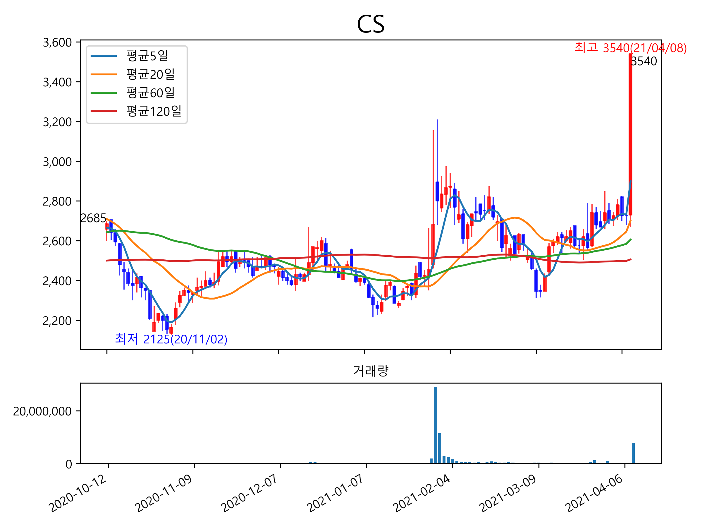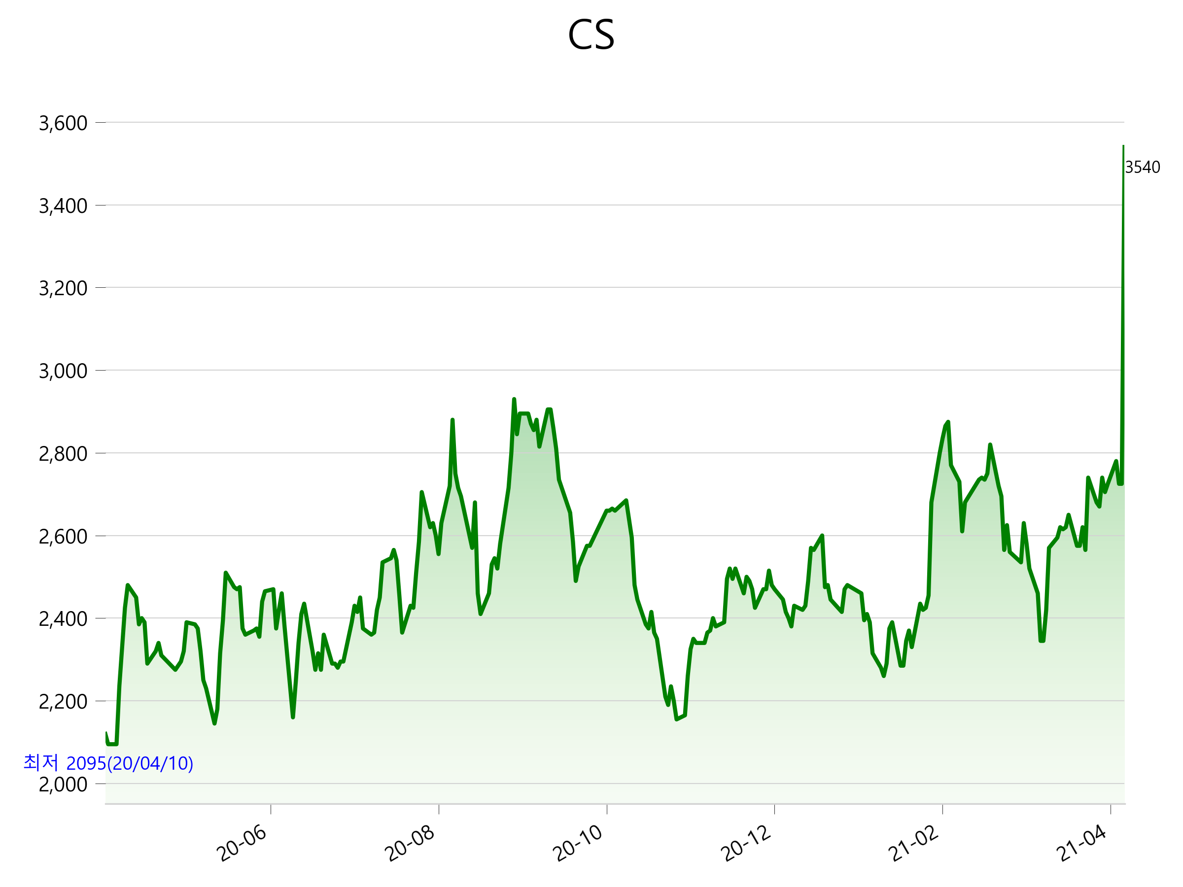 CS는 4월 8일 오후 2시부터 급격스럽게 상한가를 찍었습니다. CS는 성남시에 본사를 두고 있으며 정흥식 사내이사가 이재명지사와 중앙대 동문이라는 이유로 이재명 경기도지사 관련주로 언급되고 있습니다.