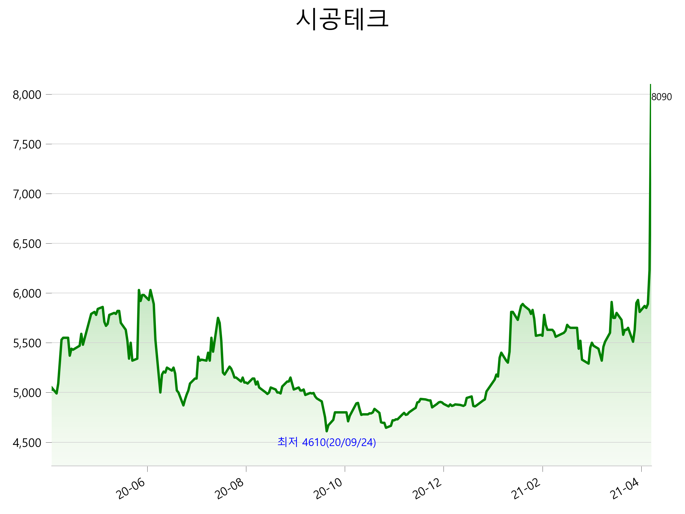 52주 최고가는 8,090원(2021-04-09), 52주 최저가는 4,610원(2020-09-24)으로 52주간 주가 상승률은 60.2% 입니다.