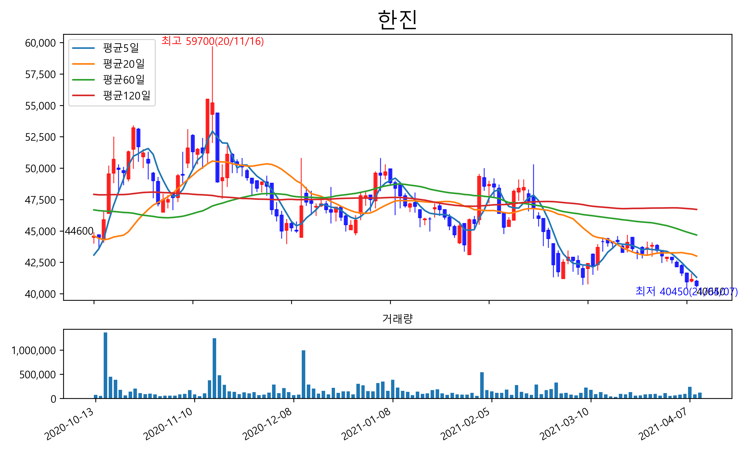 최근 6개월간 캔들차트 및 이동평균선입니다.