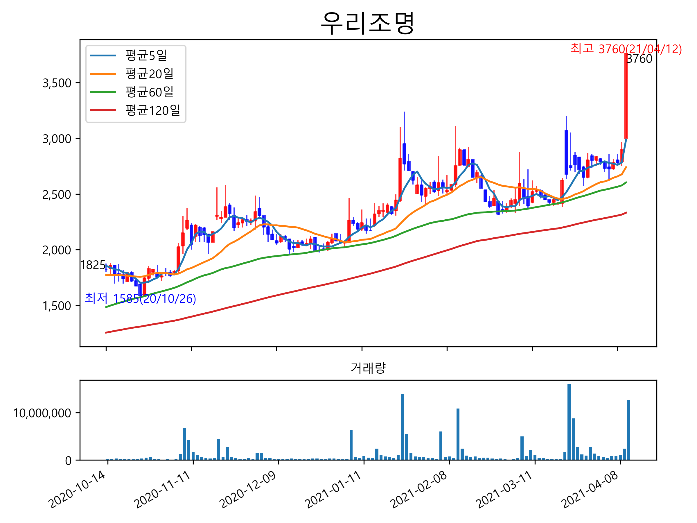 최근 6개월간 캔들차트 및 이동평균선입니다.