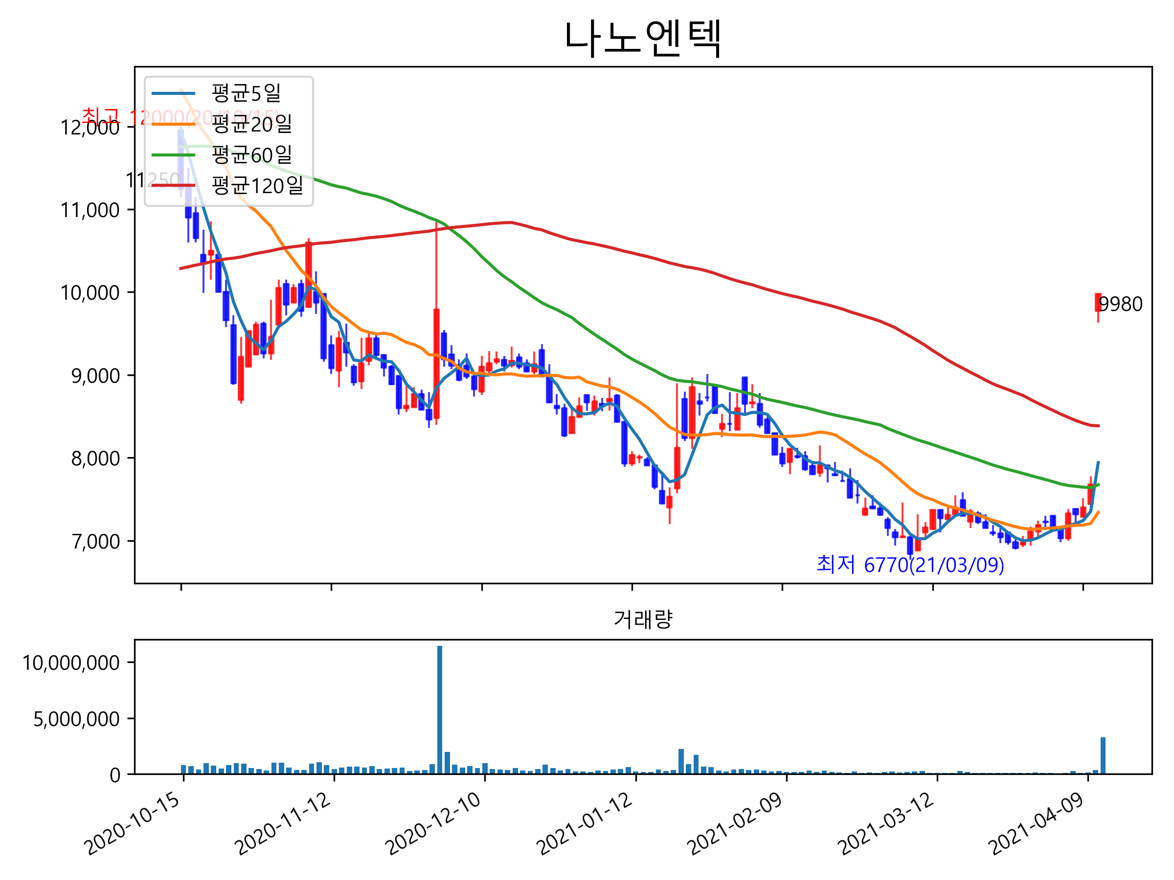 최근 6개월간 캔들차트 및 이동평균선입니다.