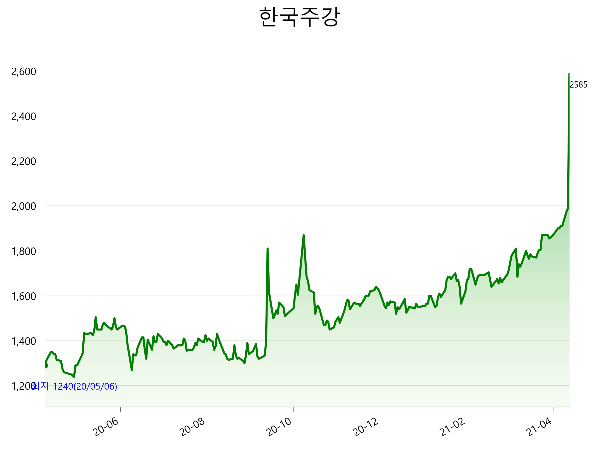 52주 최고가는 2,585원(2021-04-14), 52주 최저가는 1,240원(2020-05-06)으로 52주간 주가 상승률은 100.4% 입니다.